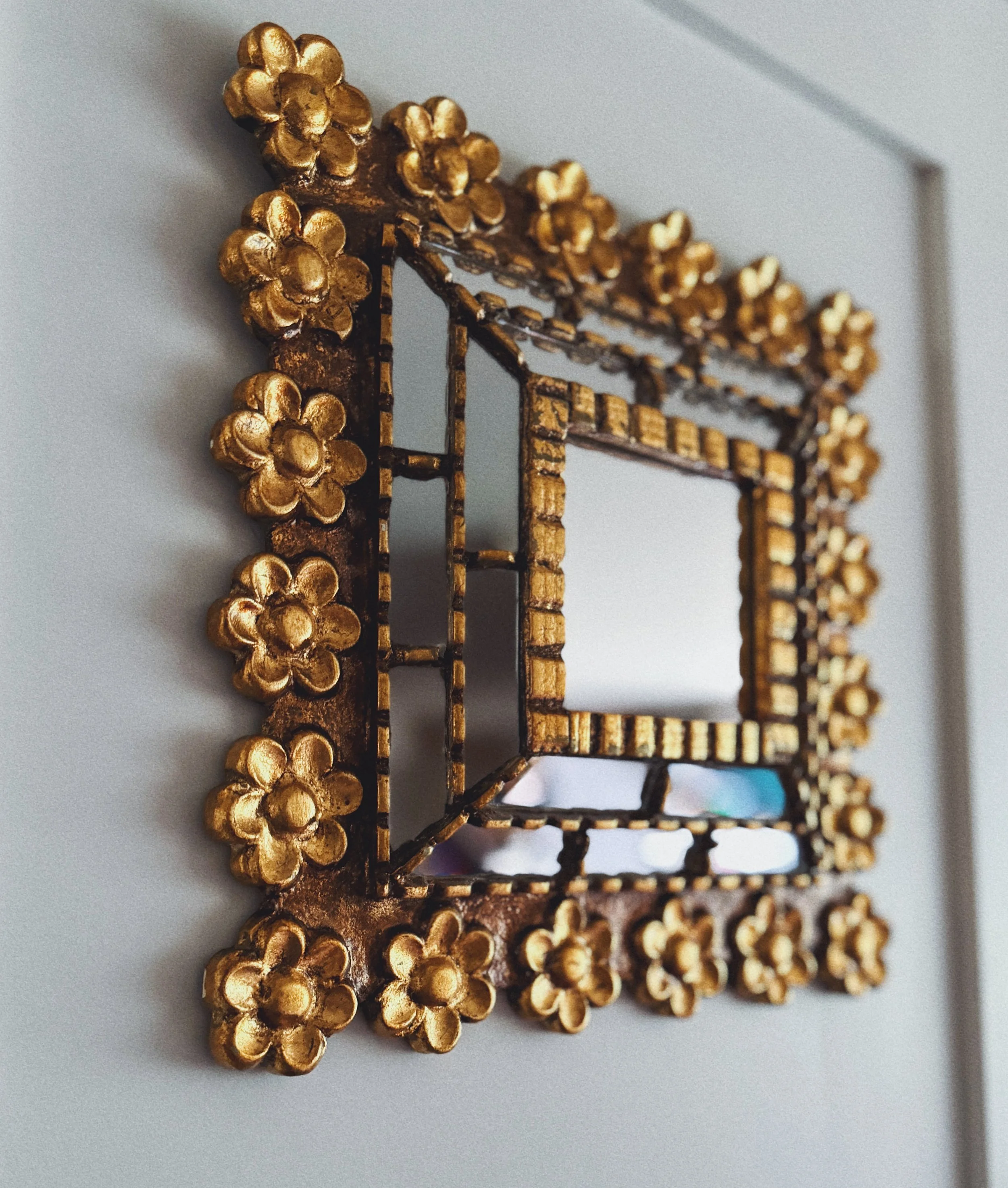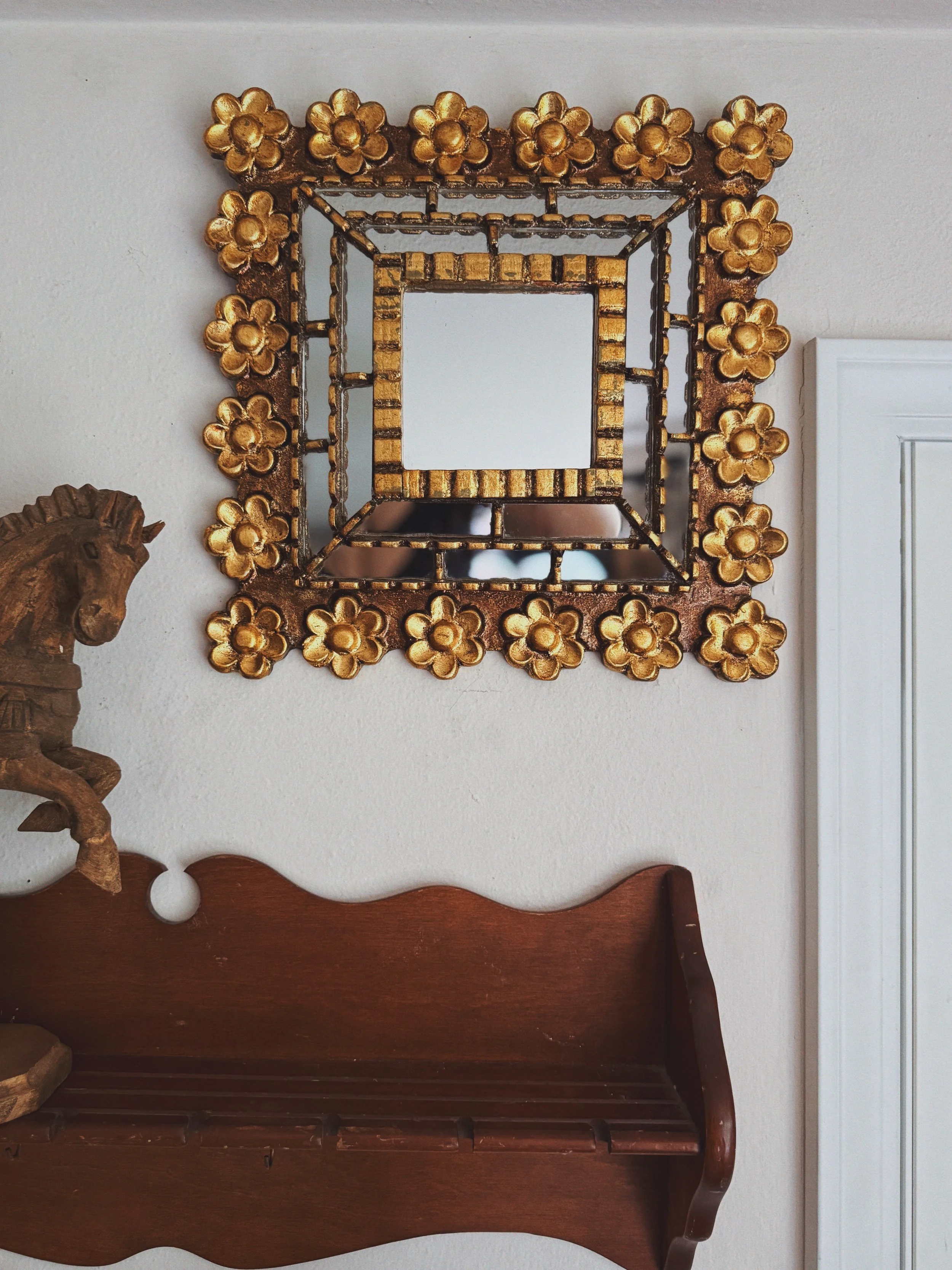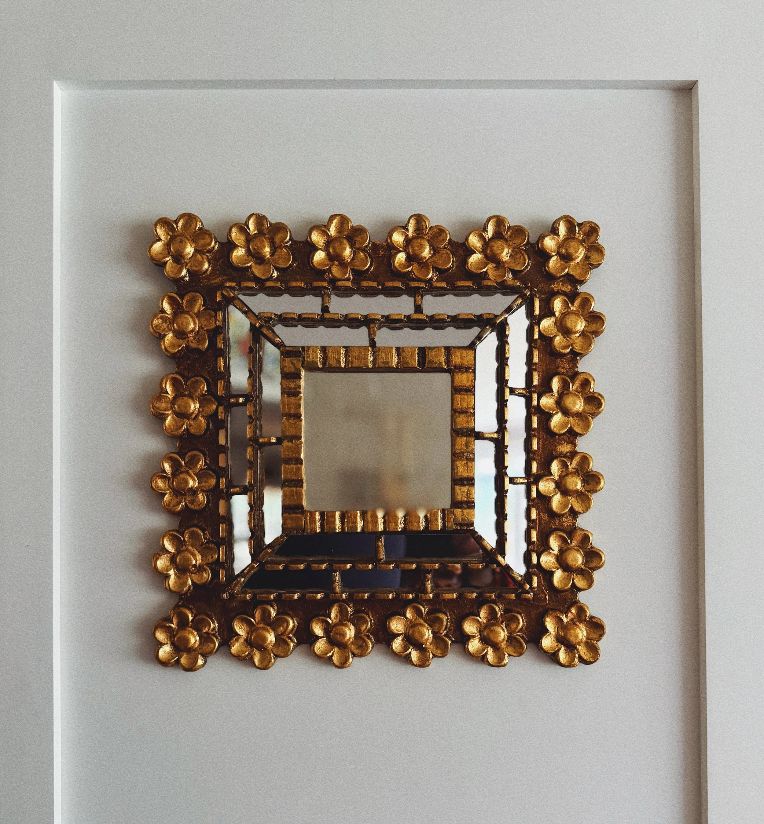 Charming vintage dimensional mirror framed in a sculptural gilt floral surround. The petite square mirror is set within a layered, openwork frame — detailed with hand-applied daisy blossoms and ribbed edging that gives the piece beautiful depth and shadow play on the wall.
