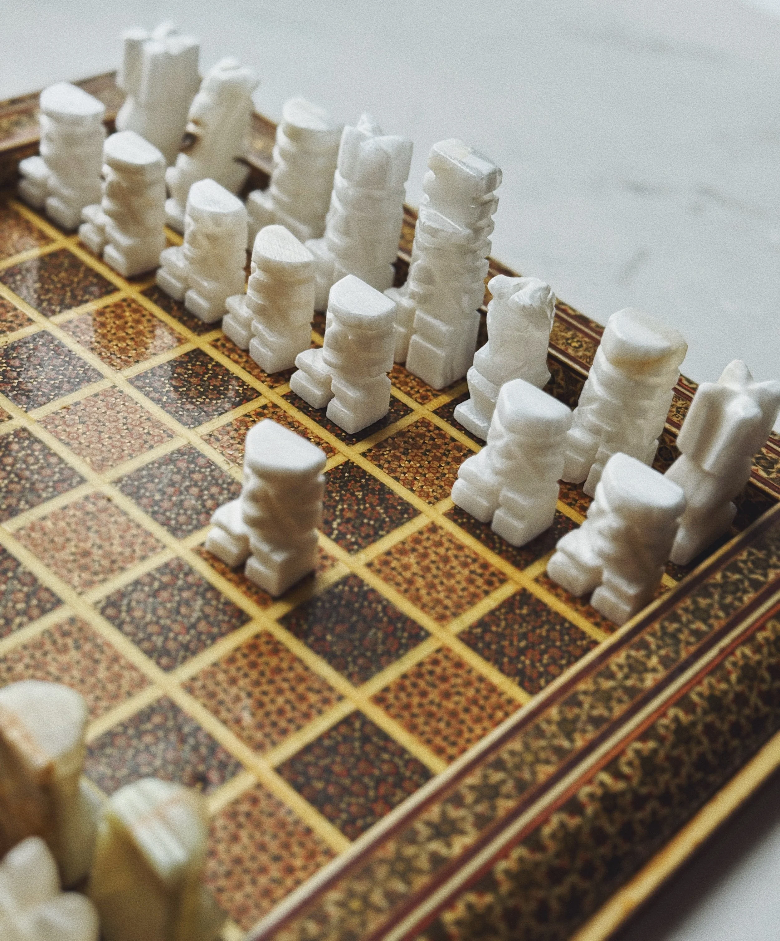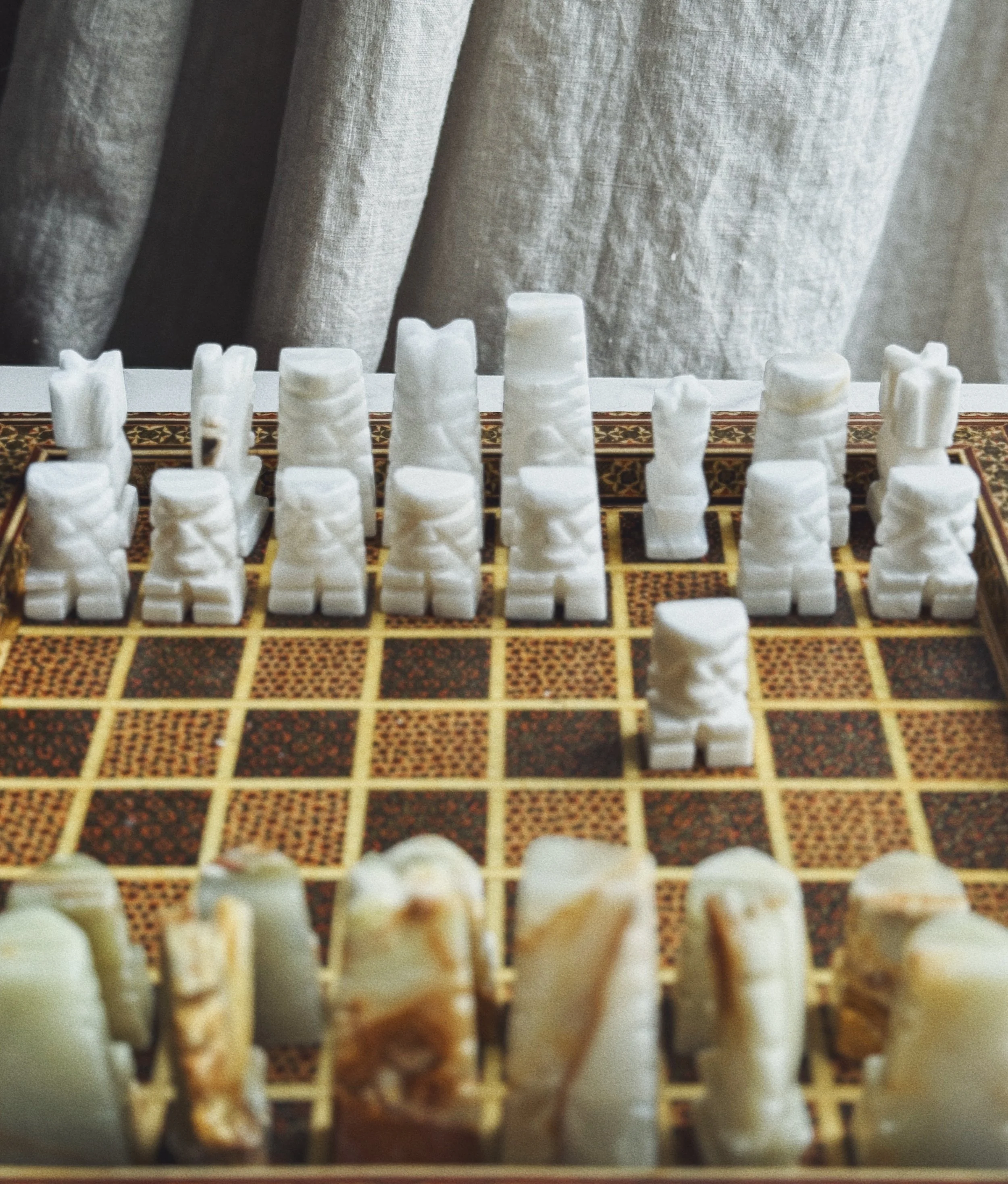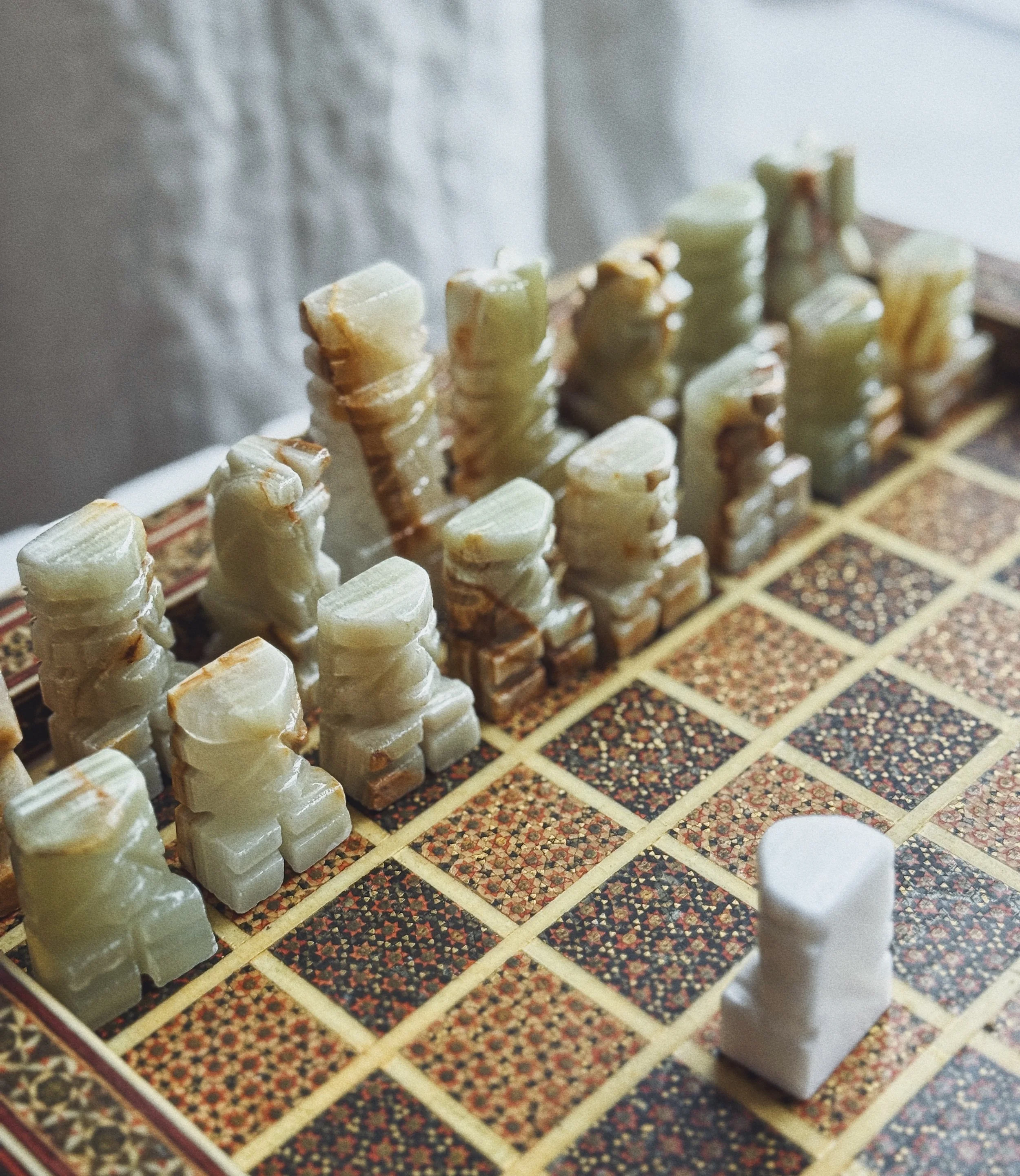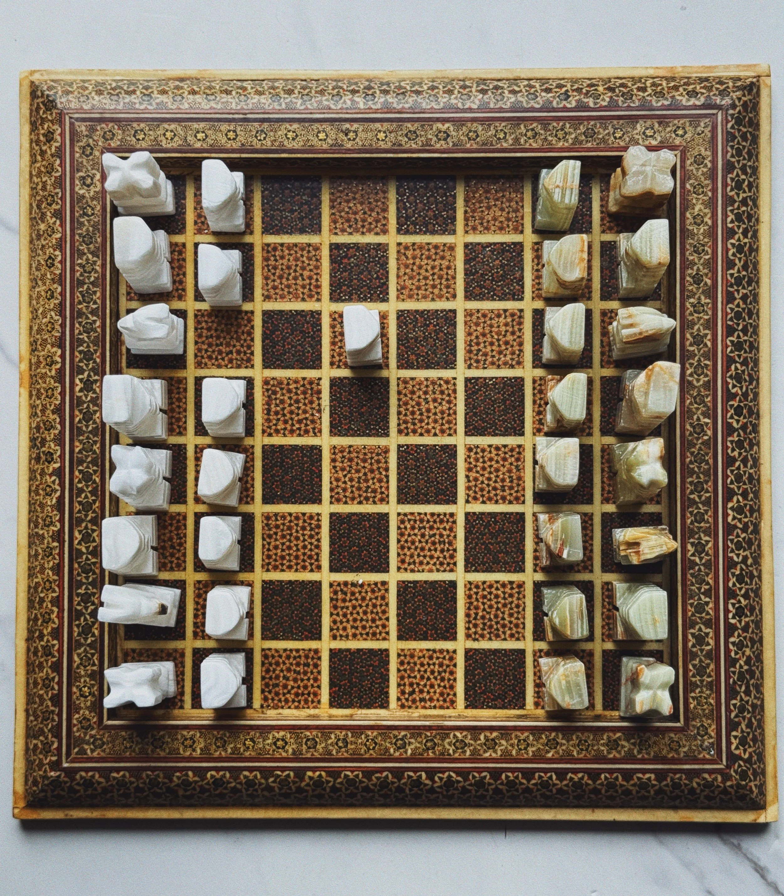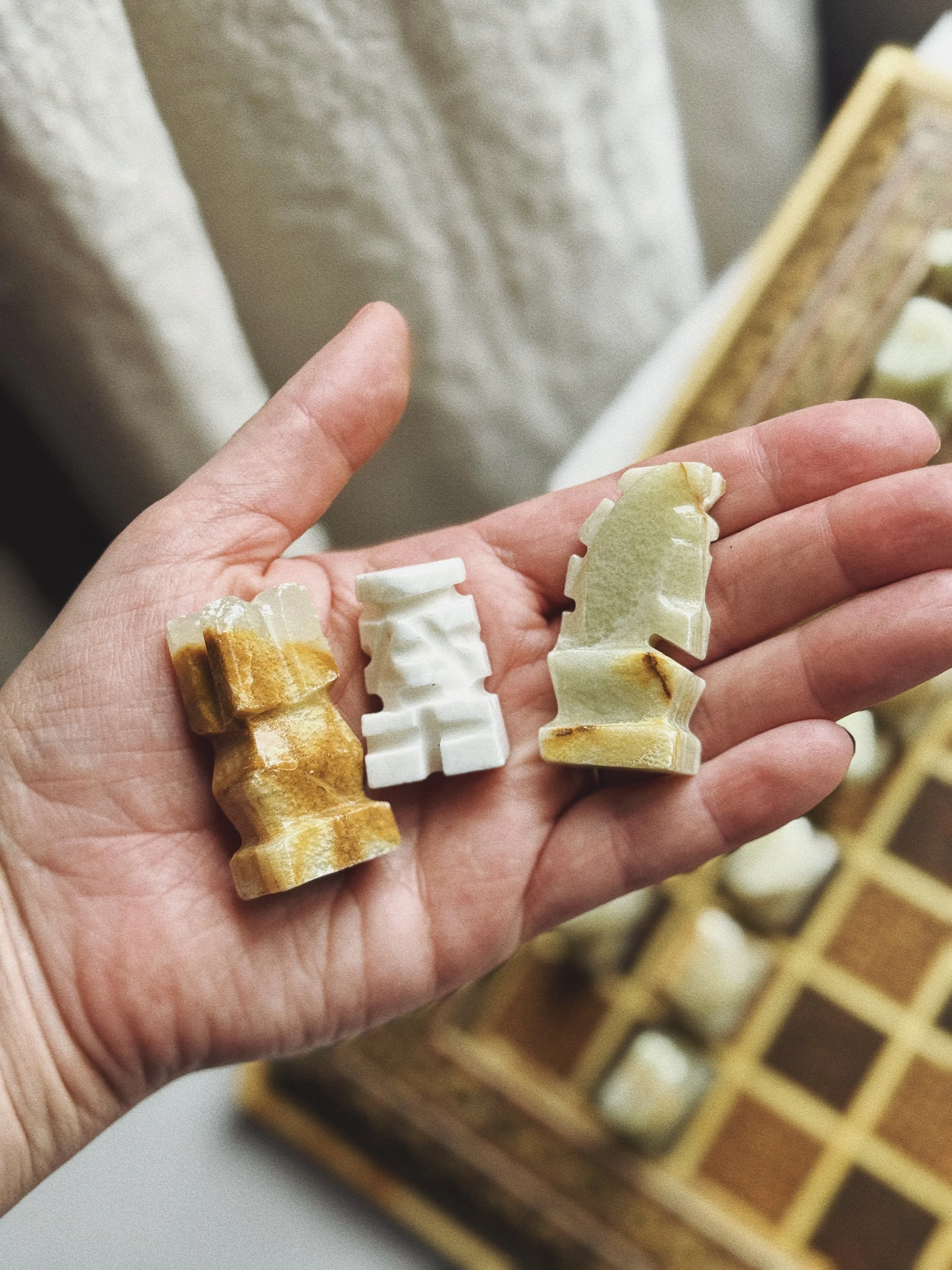 A full vintage chess set in carved alabaster and onyx, featuring creamy white and warm honey-toned pieces with beautiful natural stone variation. A gorgeous decorative object even without the board-perfect styled in a bowl, stacked on books, or kept ready for play. Board not included.