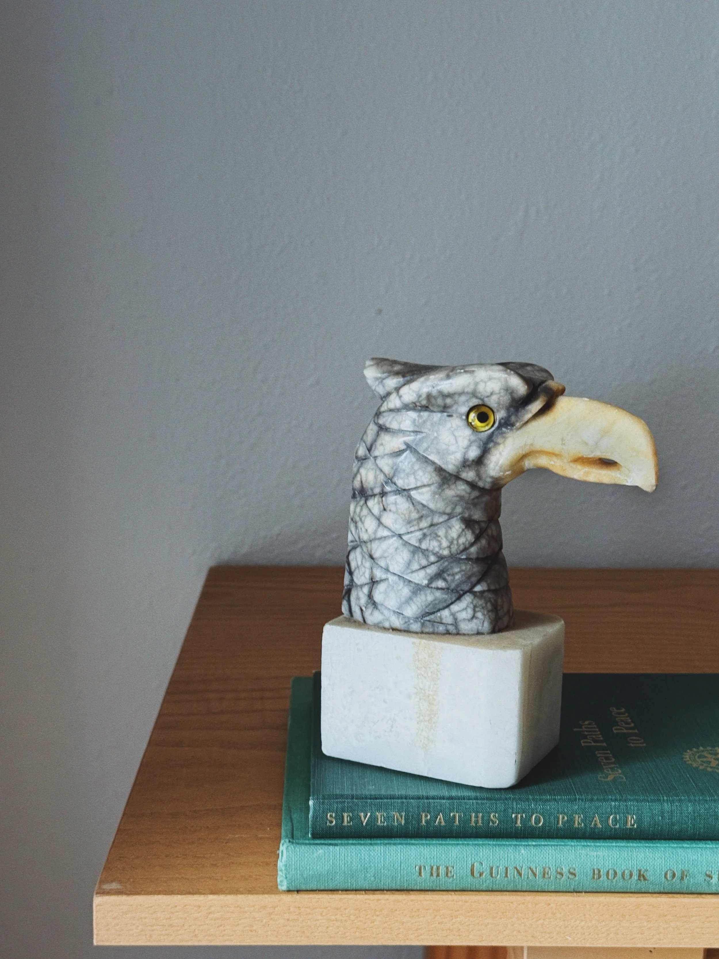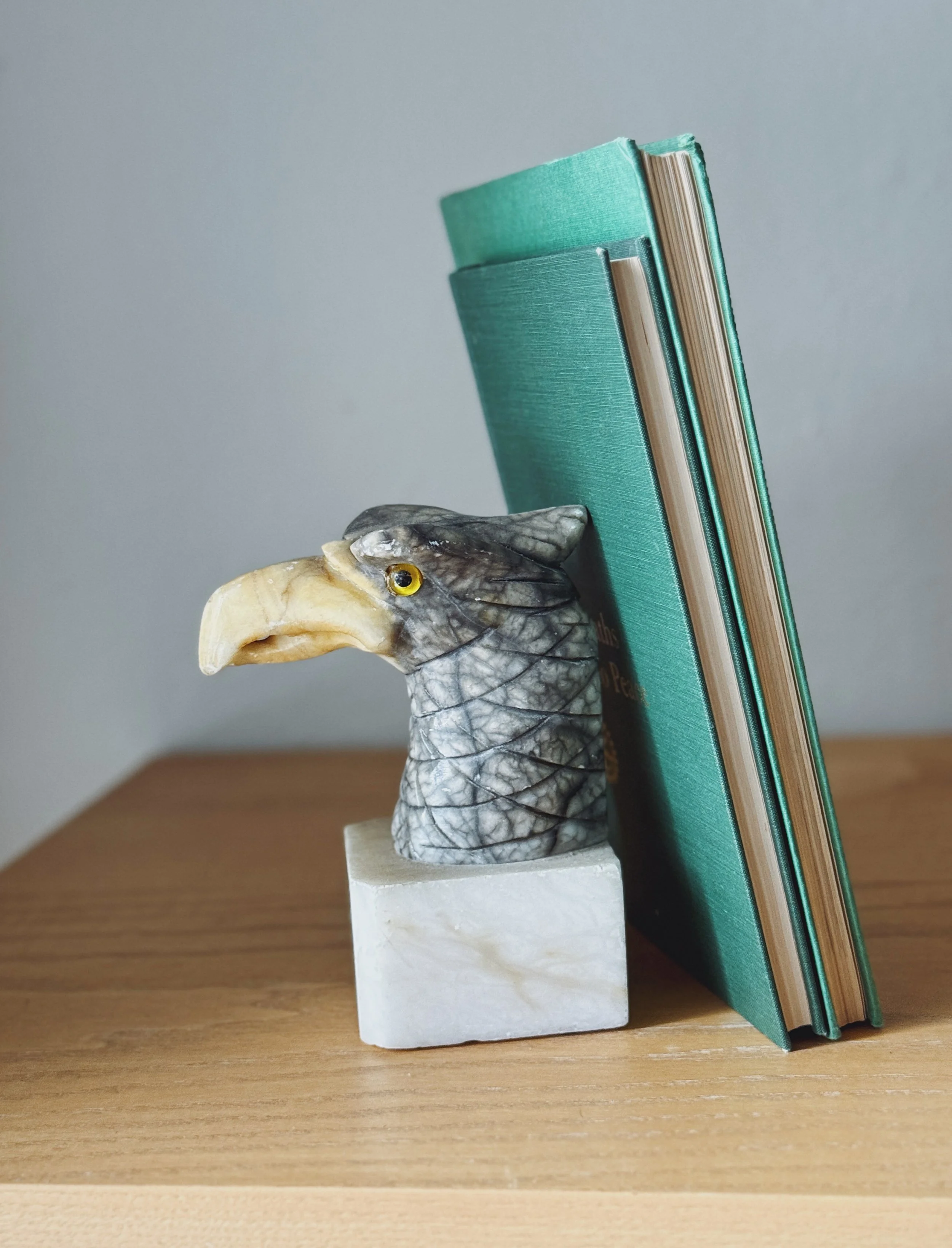 A dramatic antique carved marble eagle bust (or bookend) with a golden inset glass eye and contrasting cream beak, mounted on a stone plinth.