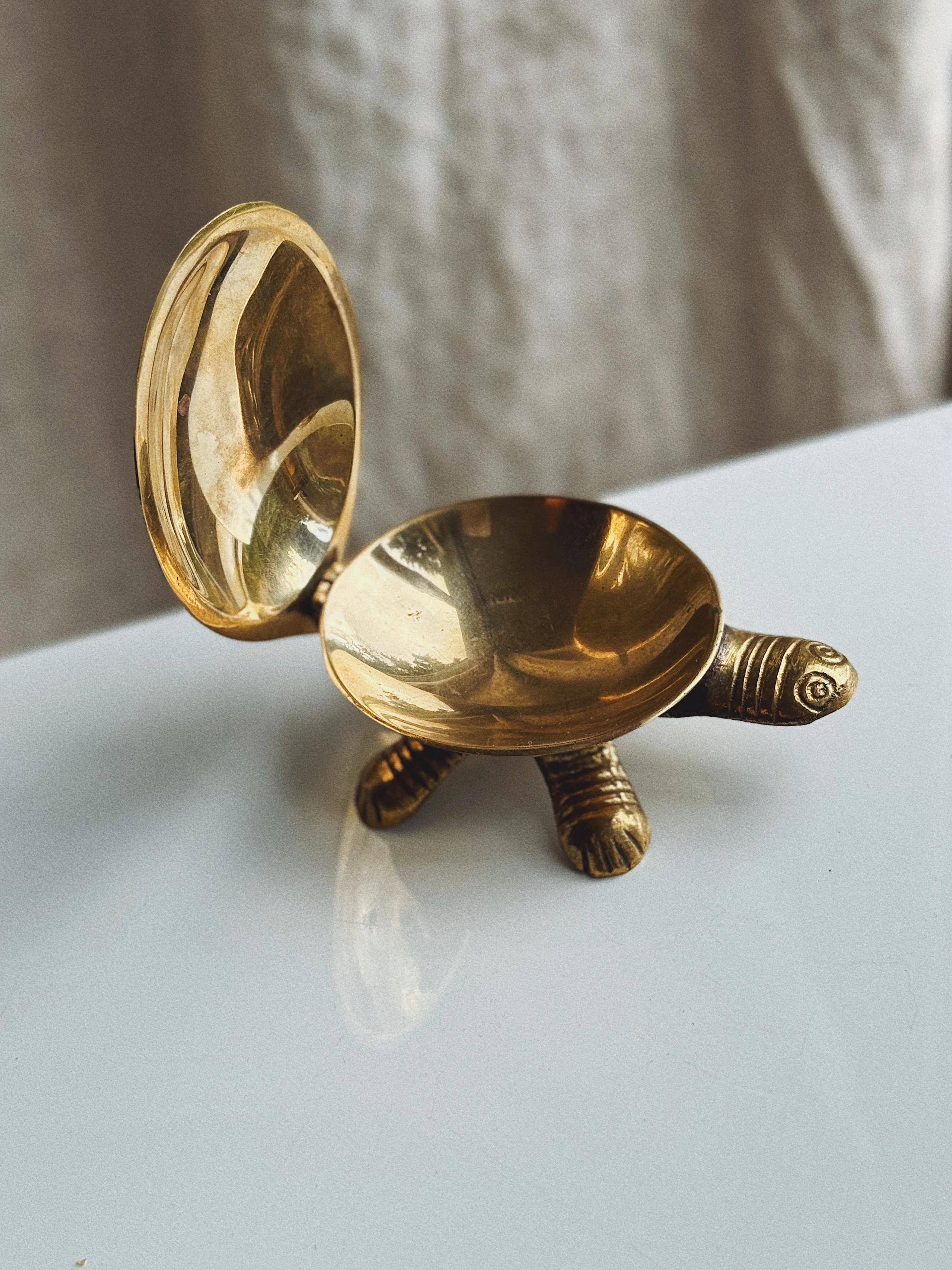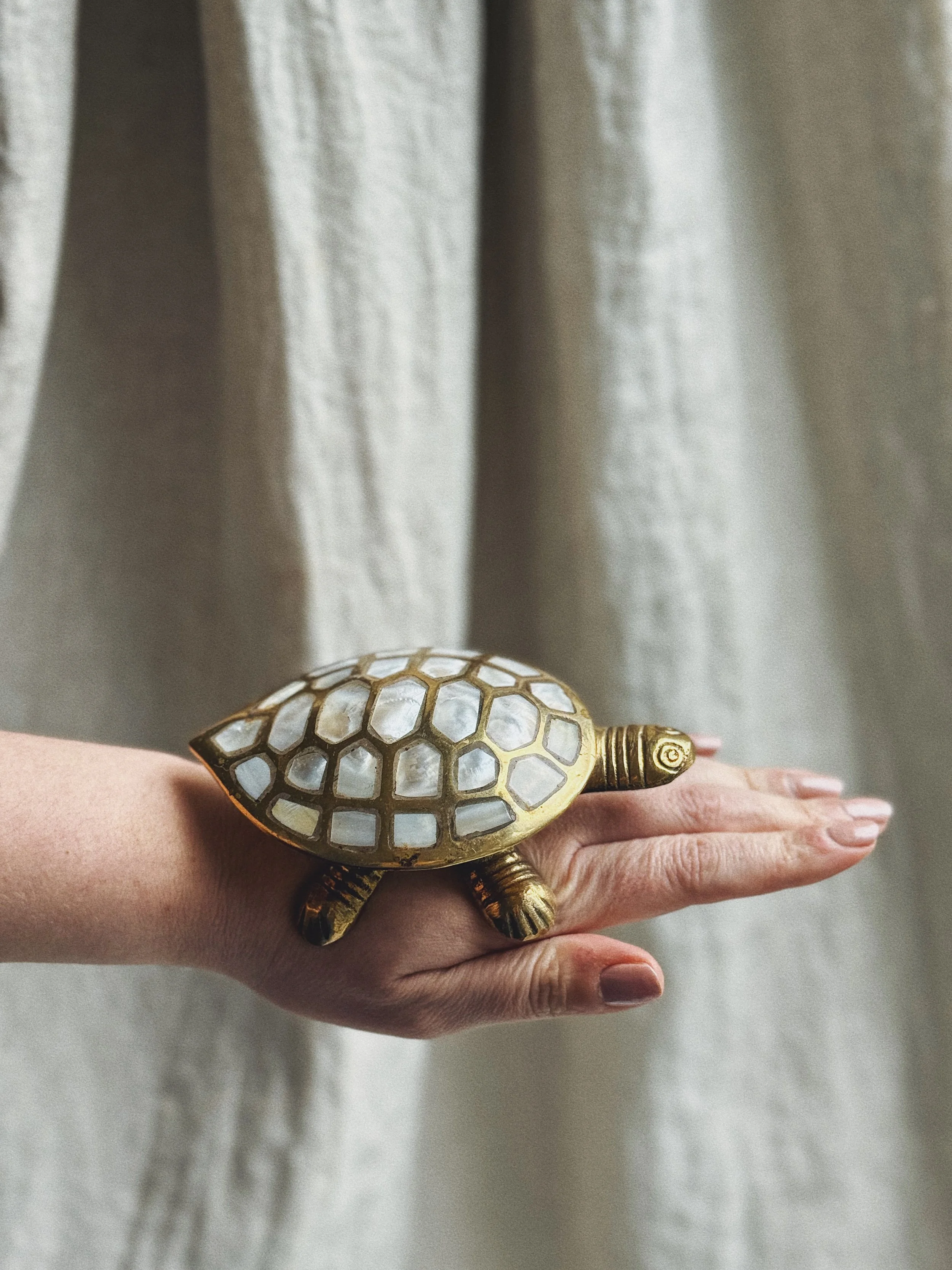 Description A beautifully detailed turtle keepsake box featuring a hinged lid and inlaid mother-of-pearl shell. The warm brass body contrasts elegantly with the luminous shell segments, giving it that heirloom, collected feel. Ideal for jewelry, pills, or tiny desk treasures.