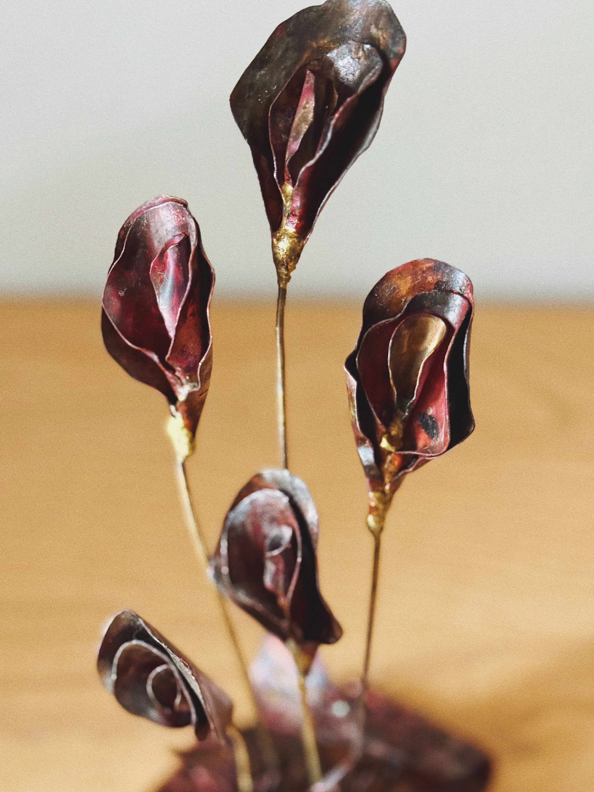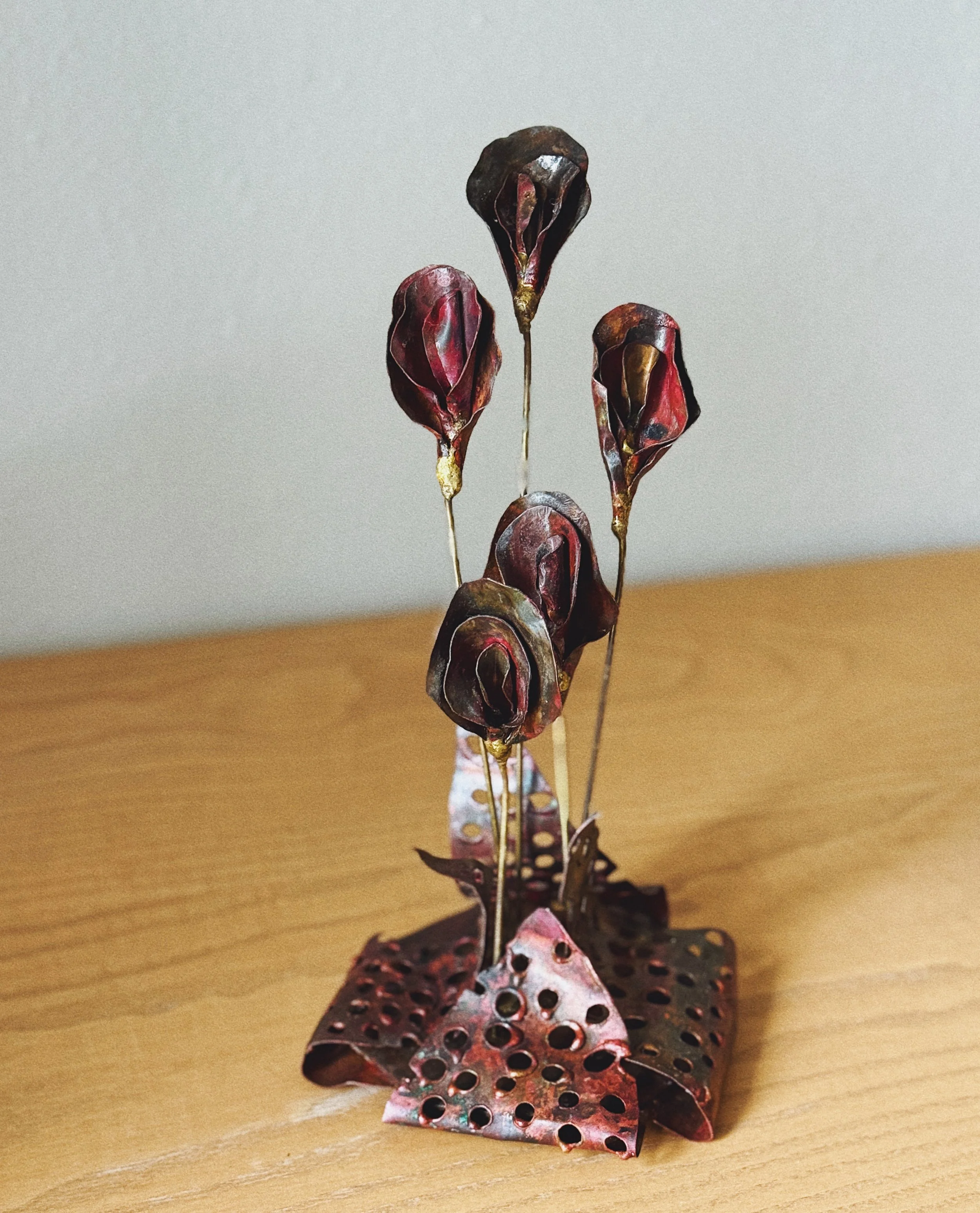 A striking hand-formed copper sculpture featuring five stylized calla lilies rising from a perforated, folded metal base. The deep oxblood and bronze patina gives it a moody, almost painterly quality.