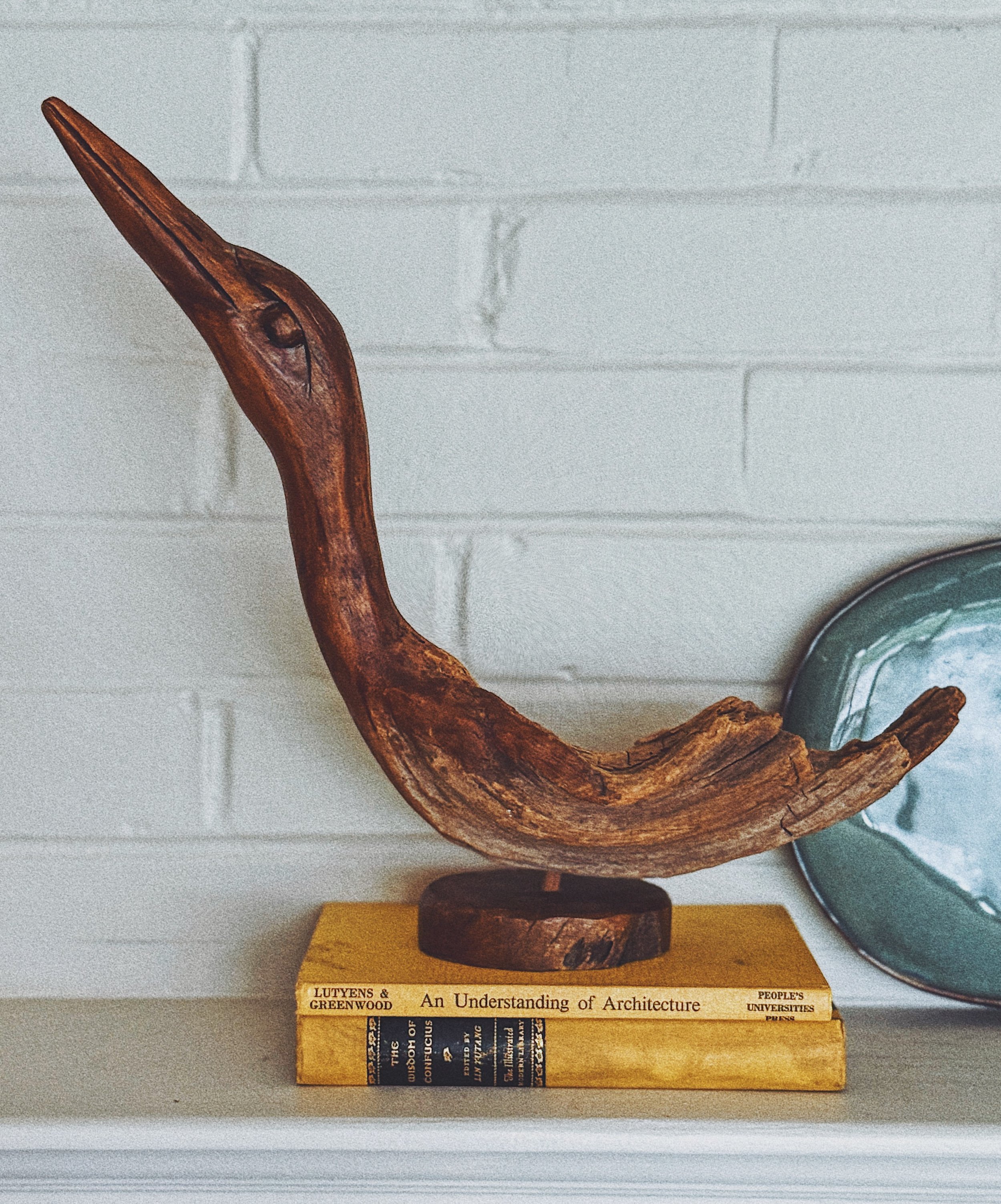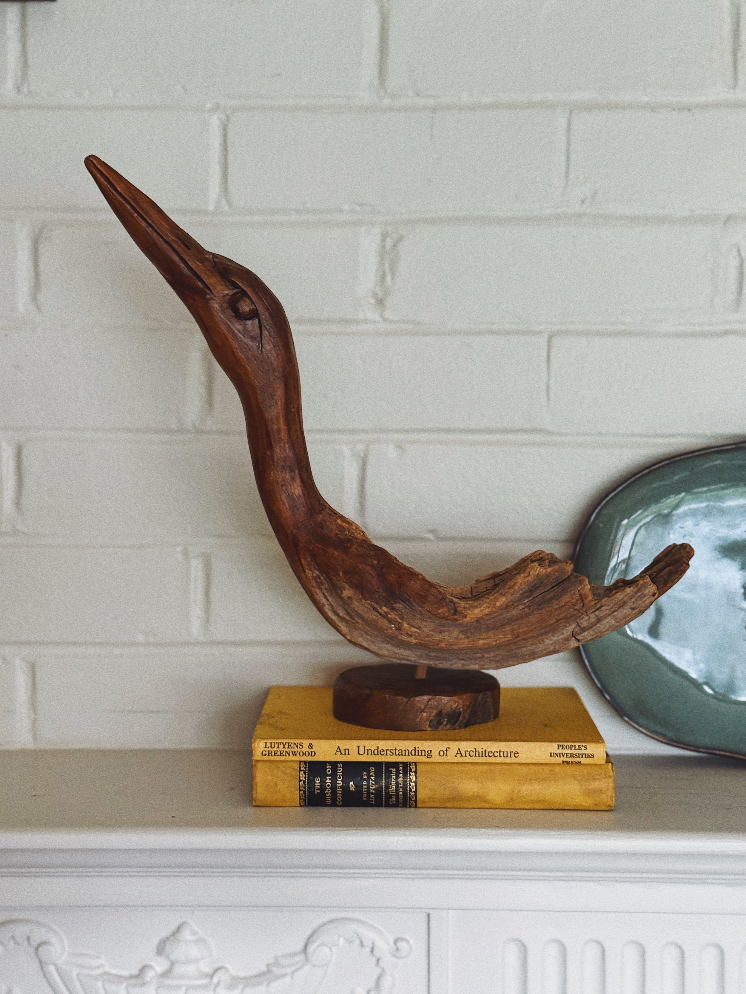 An expressive driftwood bird sculpture, mounted on a simple base. The natural curves and weathered texture give it a sense of movement-almost like it's mid-flight. A really special organic piece that adds contrast to more refined objects.