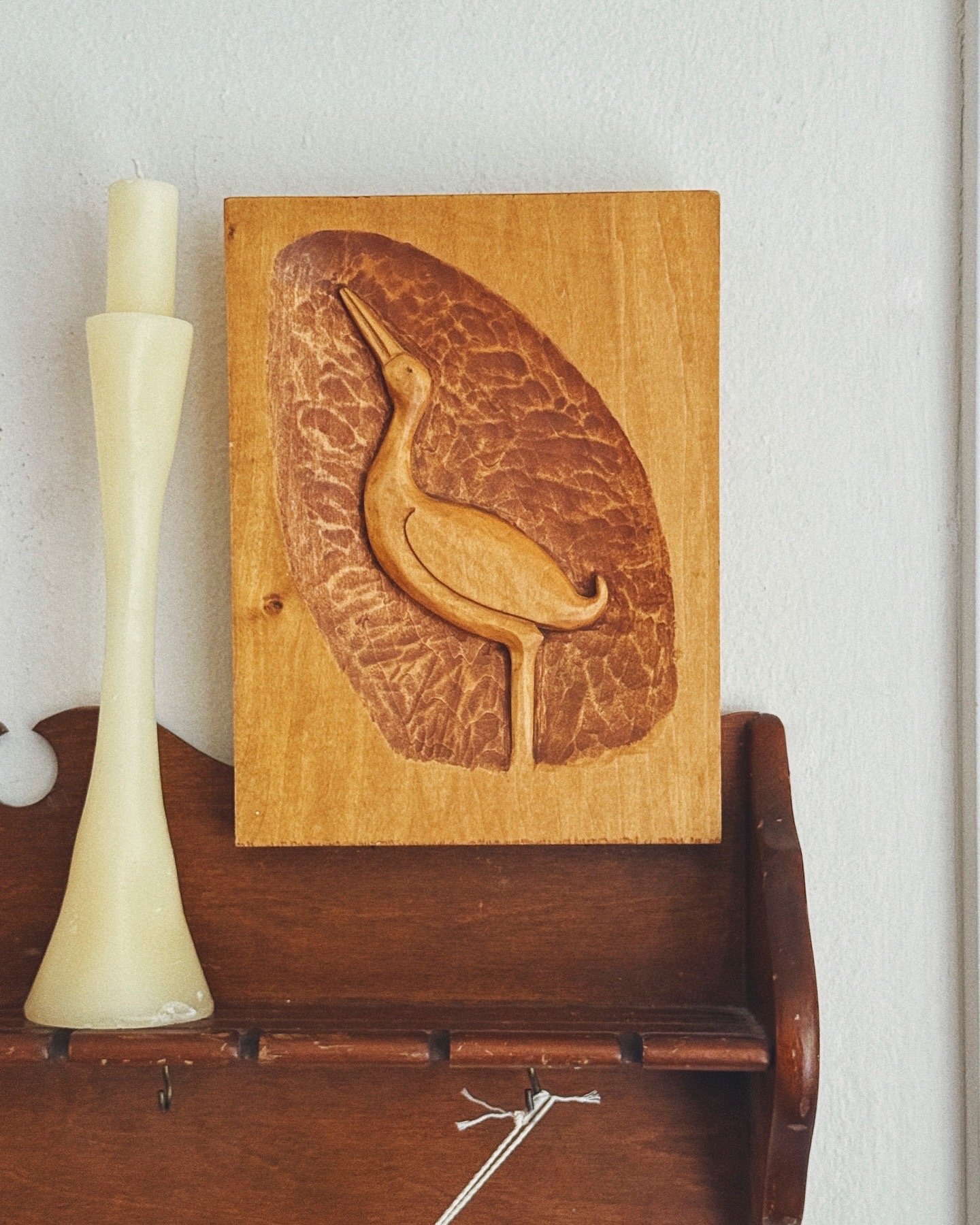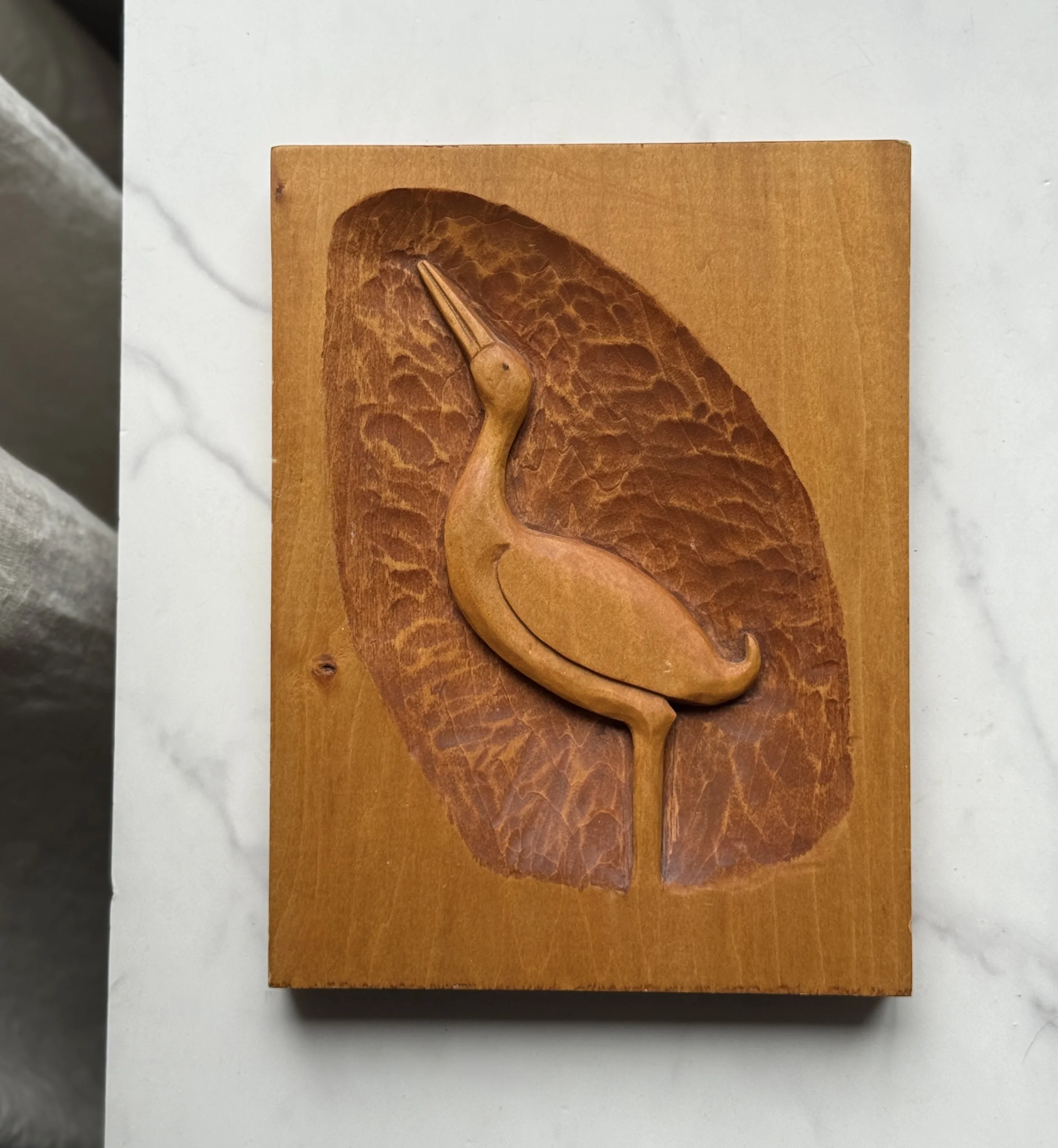 A warm-toned carved wooden wall plaque featuring a stylized long-legged bird in relief. The contrast between smooth carving and textured background gives it a beautiful handmade feel. A sweet folk-inspired piece for layering or leaning.