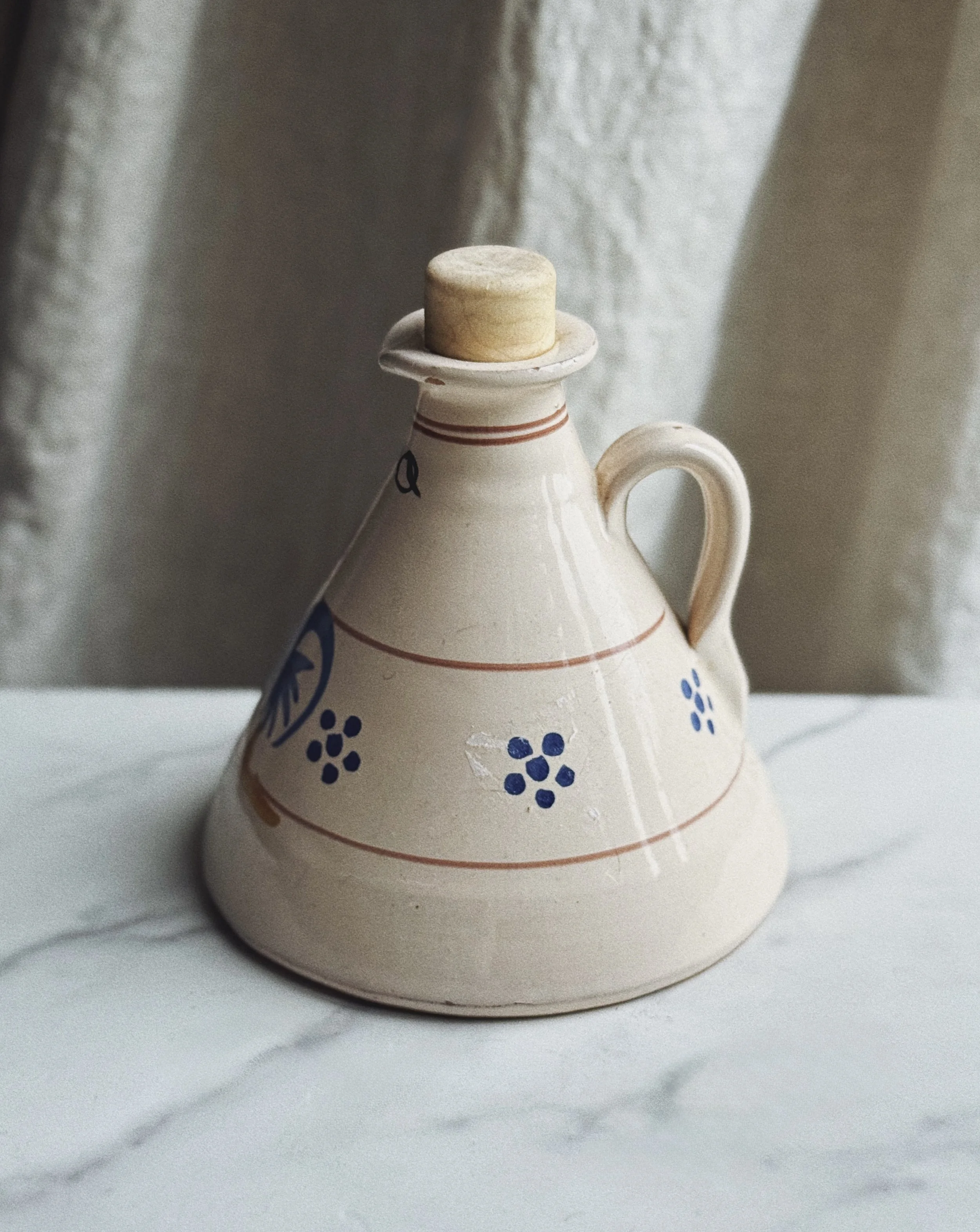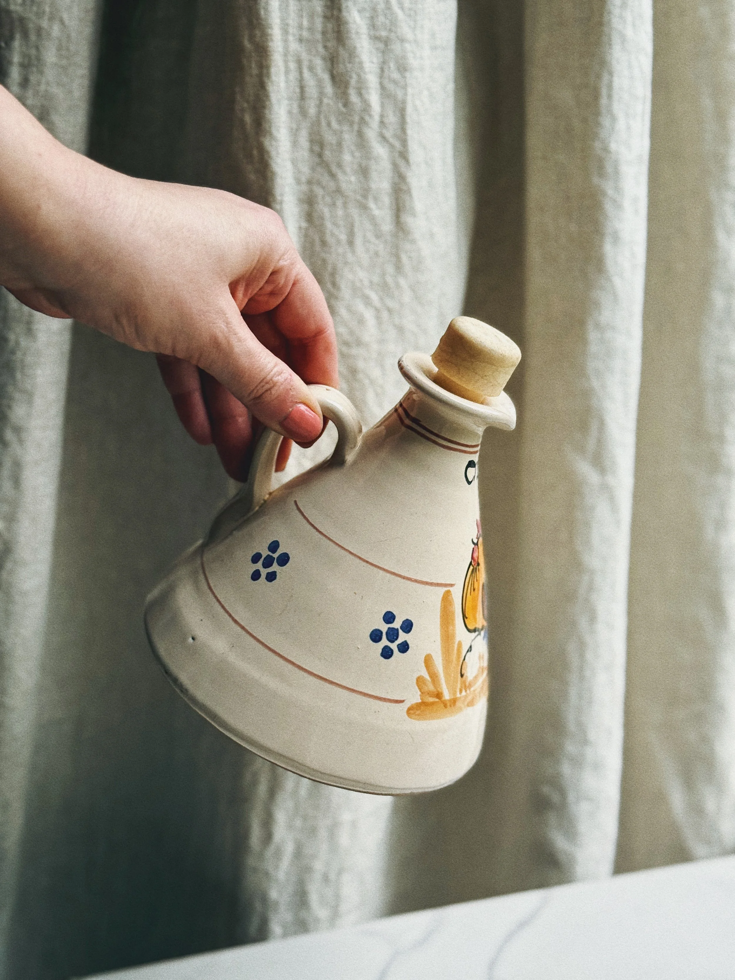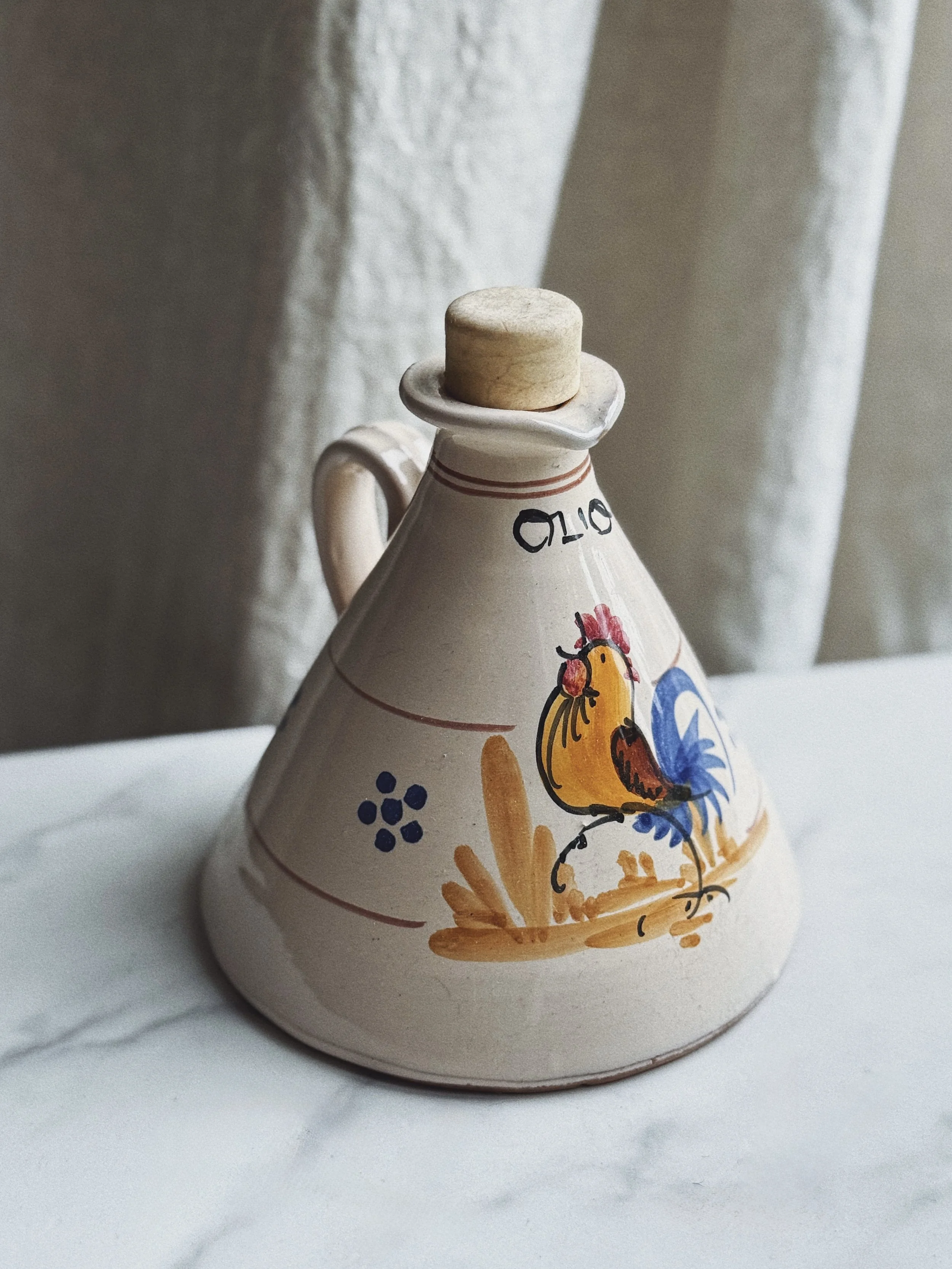 A charming hand-painted ceramic oil cruet featuring a rooster motif and cork stopper. Likely European, with a folk-art feel and warm, rustic palette. Functional or purely decorative-equally sweet styled in a kitchen.