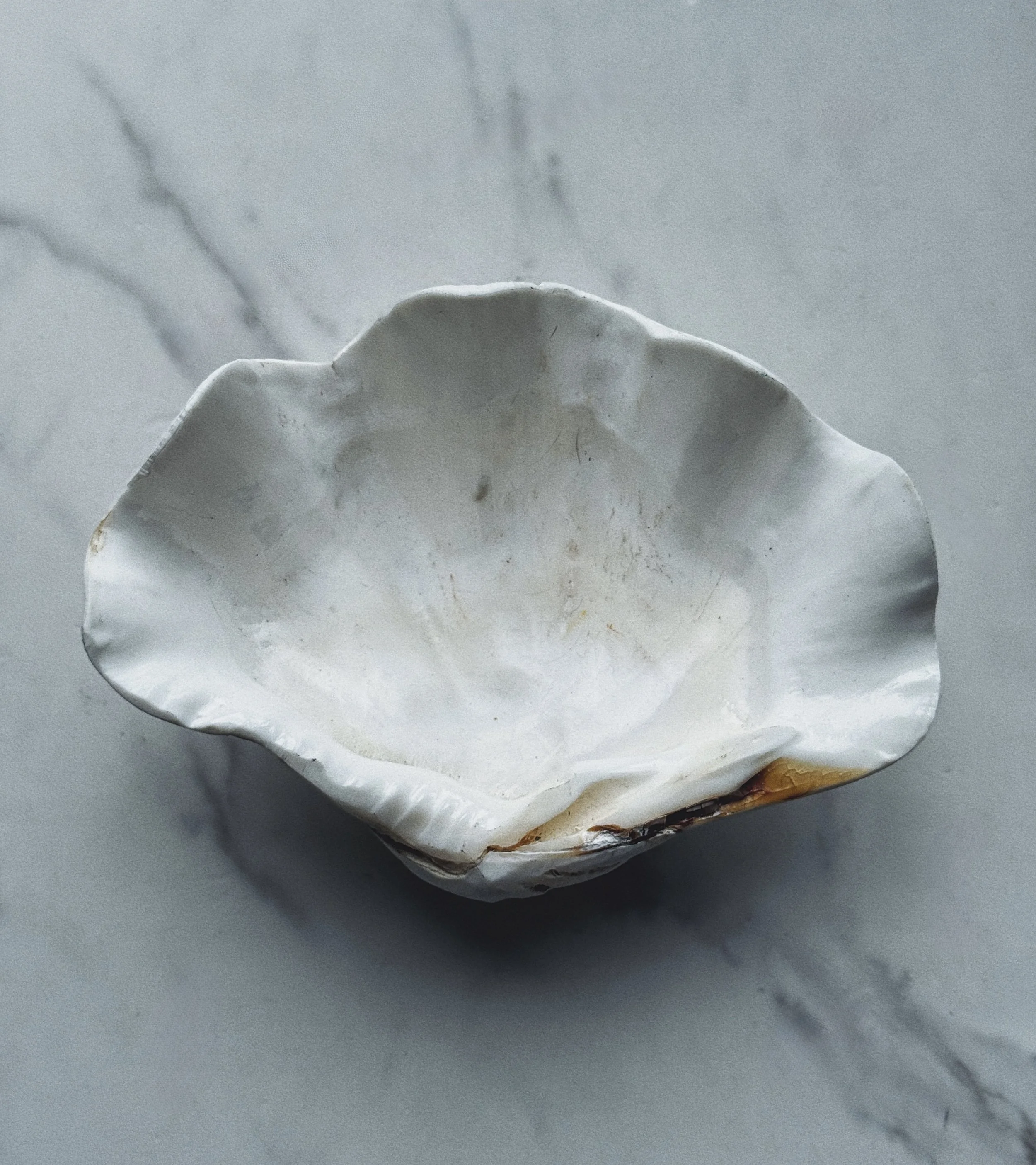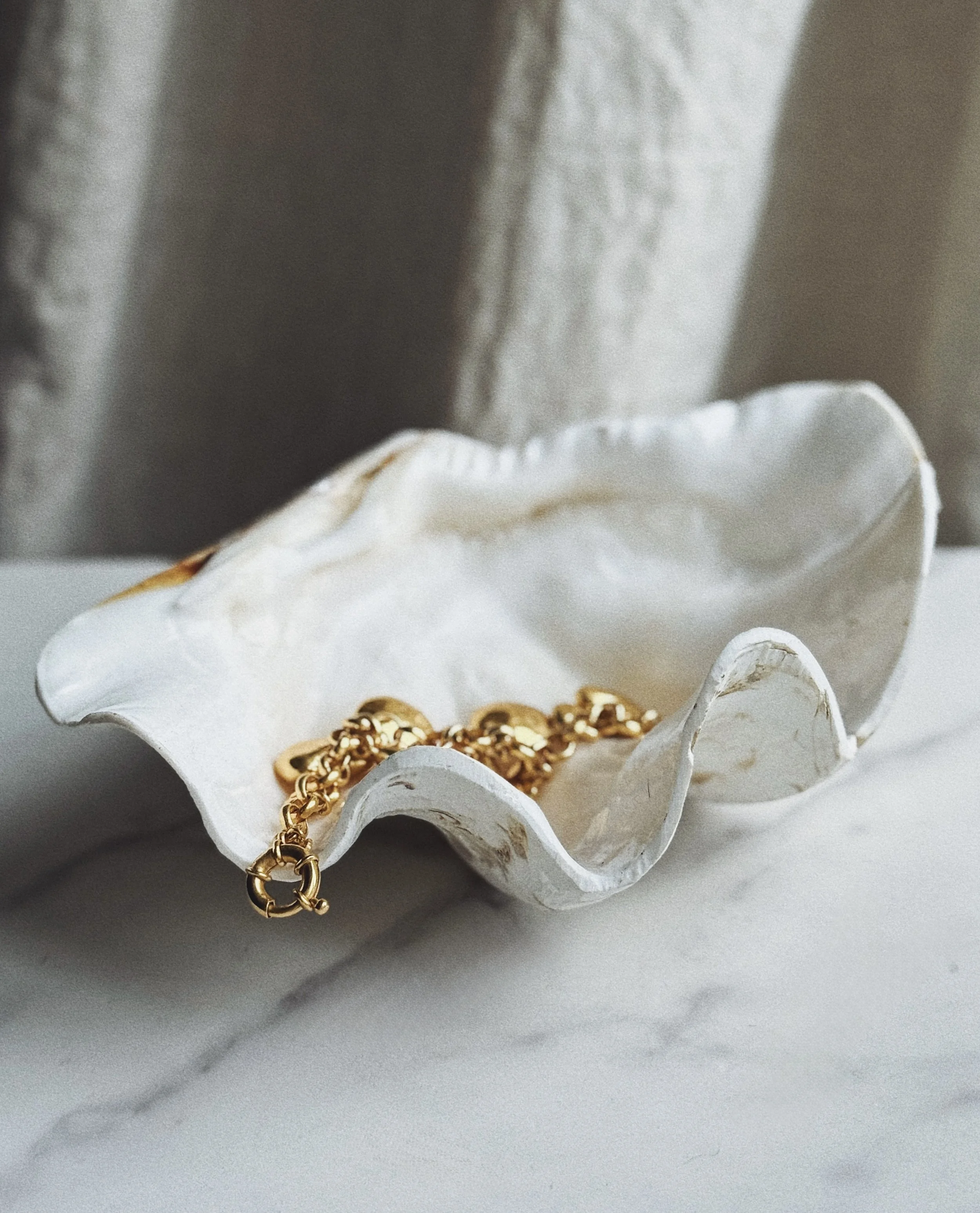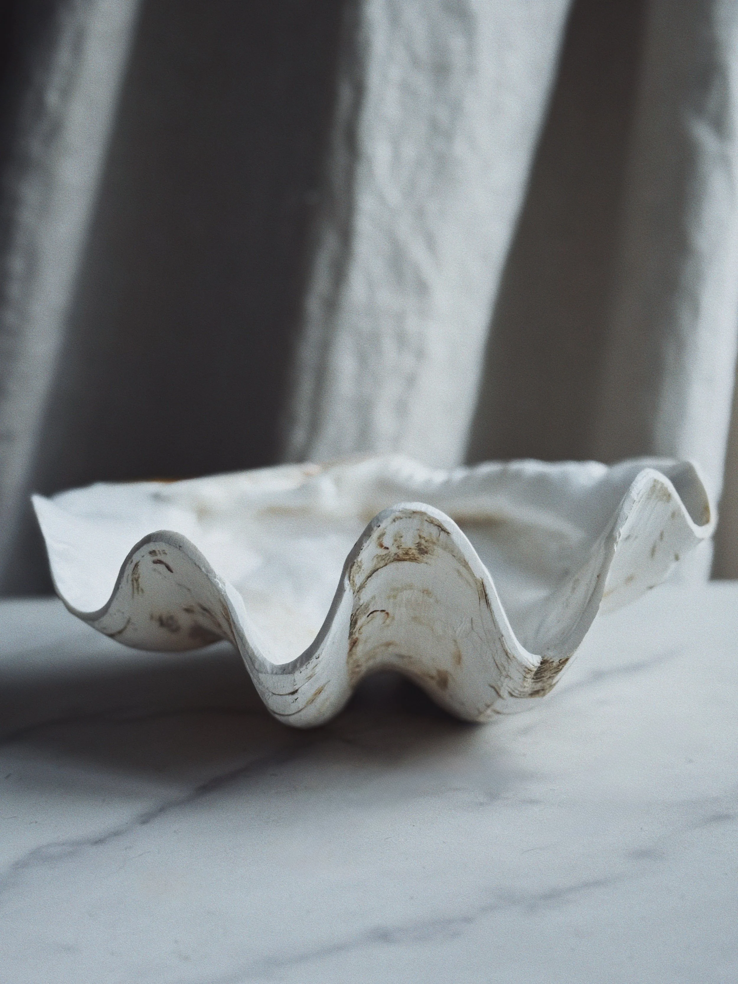 A large shell-form catchall with soft ivory tones and organic movement throughout. Perfect for jewelry, matches, or small keepsakes-equally beautiful styled in a bathroom, bedside, or on a coffee table.