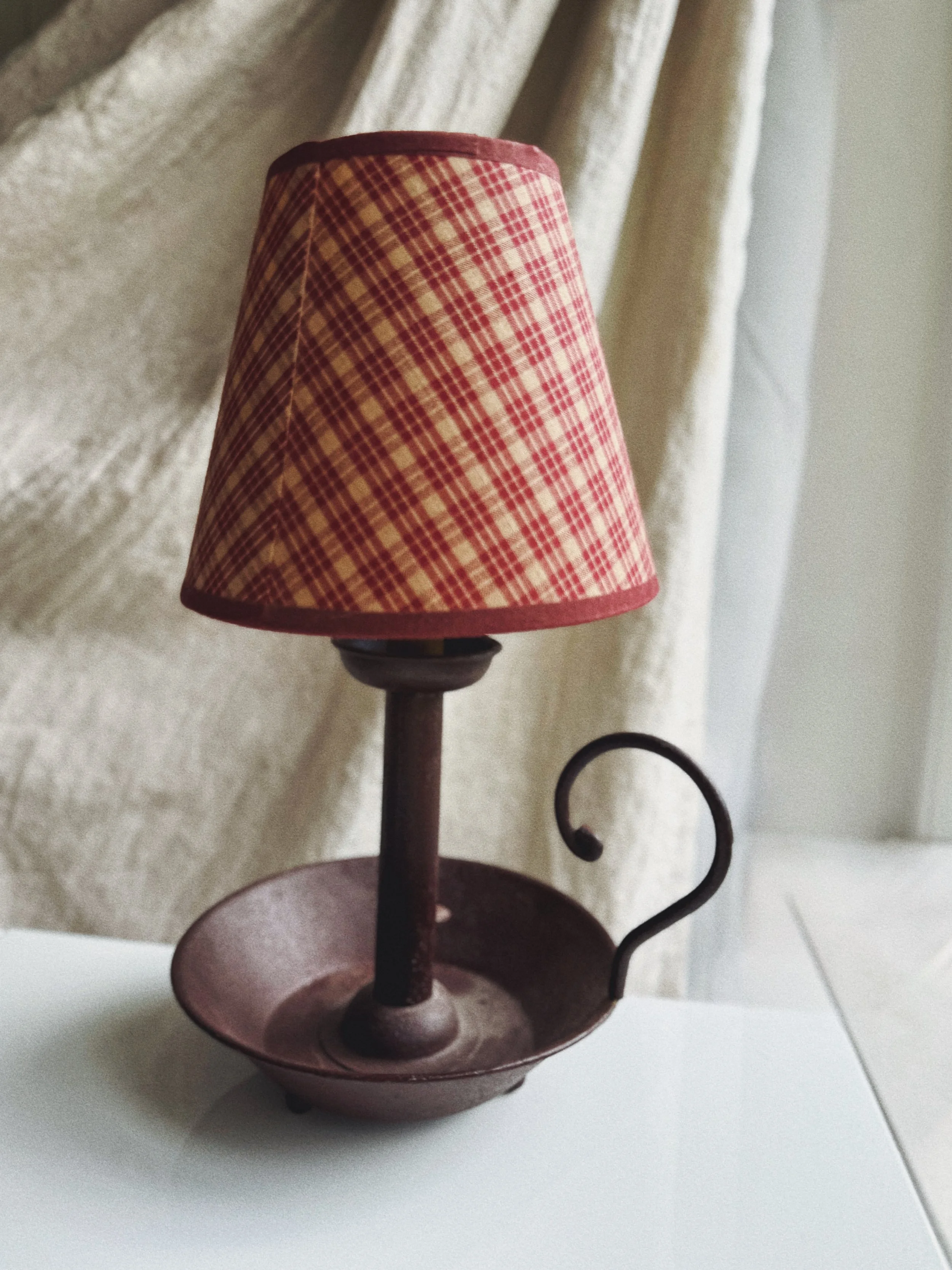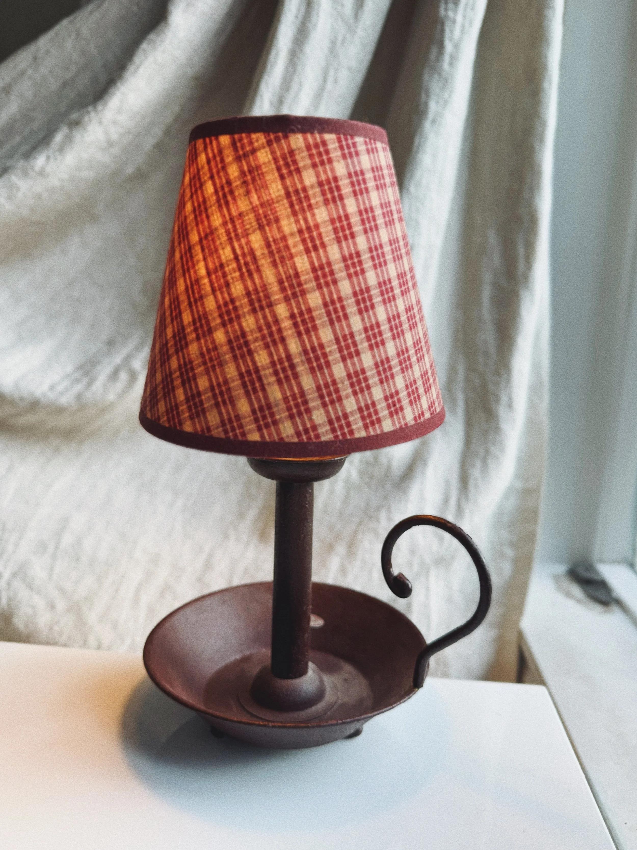 Whimsical miniature candleholder lamp featuring a rusted metal base with finger loop handle and a warm plaid fabric shade. Evokes cozy cottage and primitive d�cor styling � perfect for shelves, bedside tables, or holiday layering.