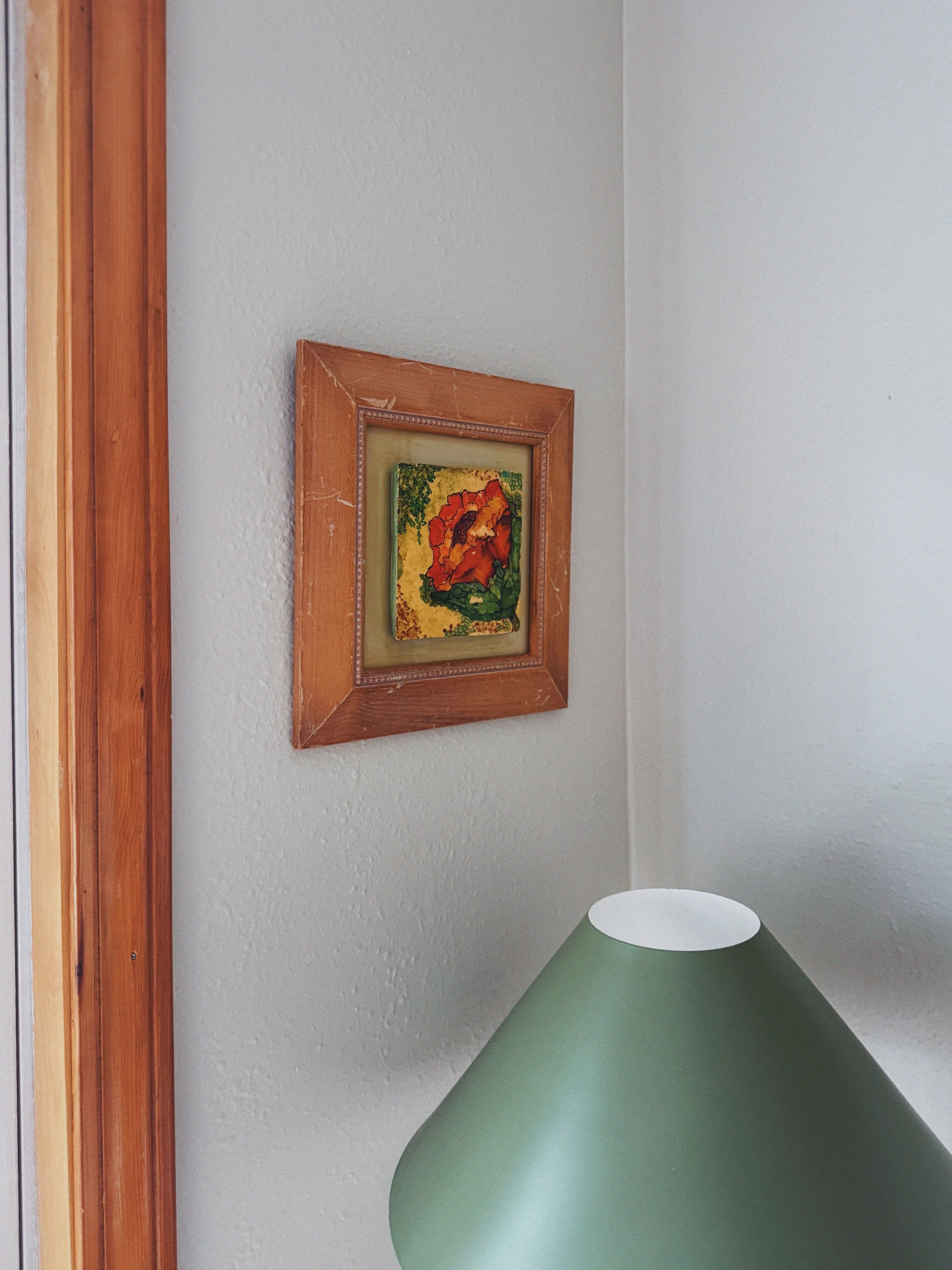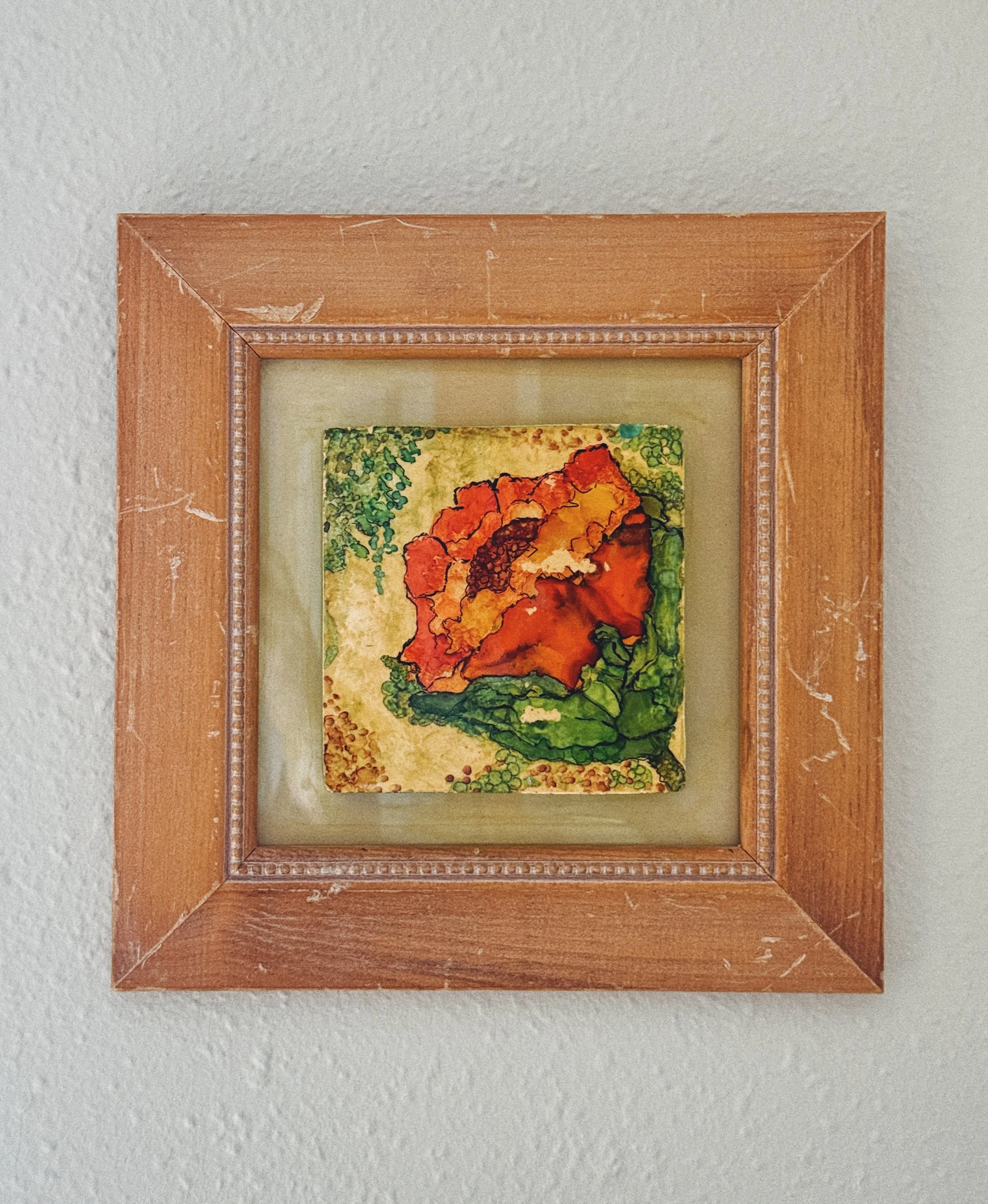 A richly colored vintage floral art tile featuring a painterly orange bloom set against a soft, stippled ground of greens and warm neutrals. Mounted within a classic wood frame with beaded inner detail, it has the feel of a collected European wall accent — intimate in scale but visually striking.