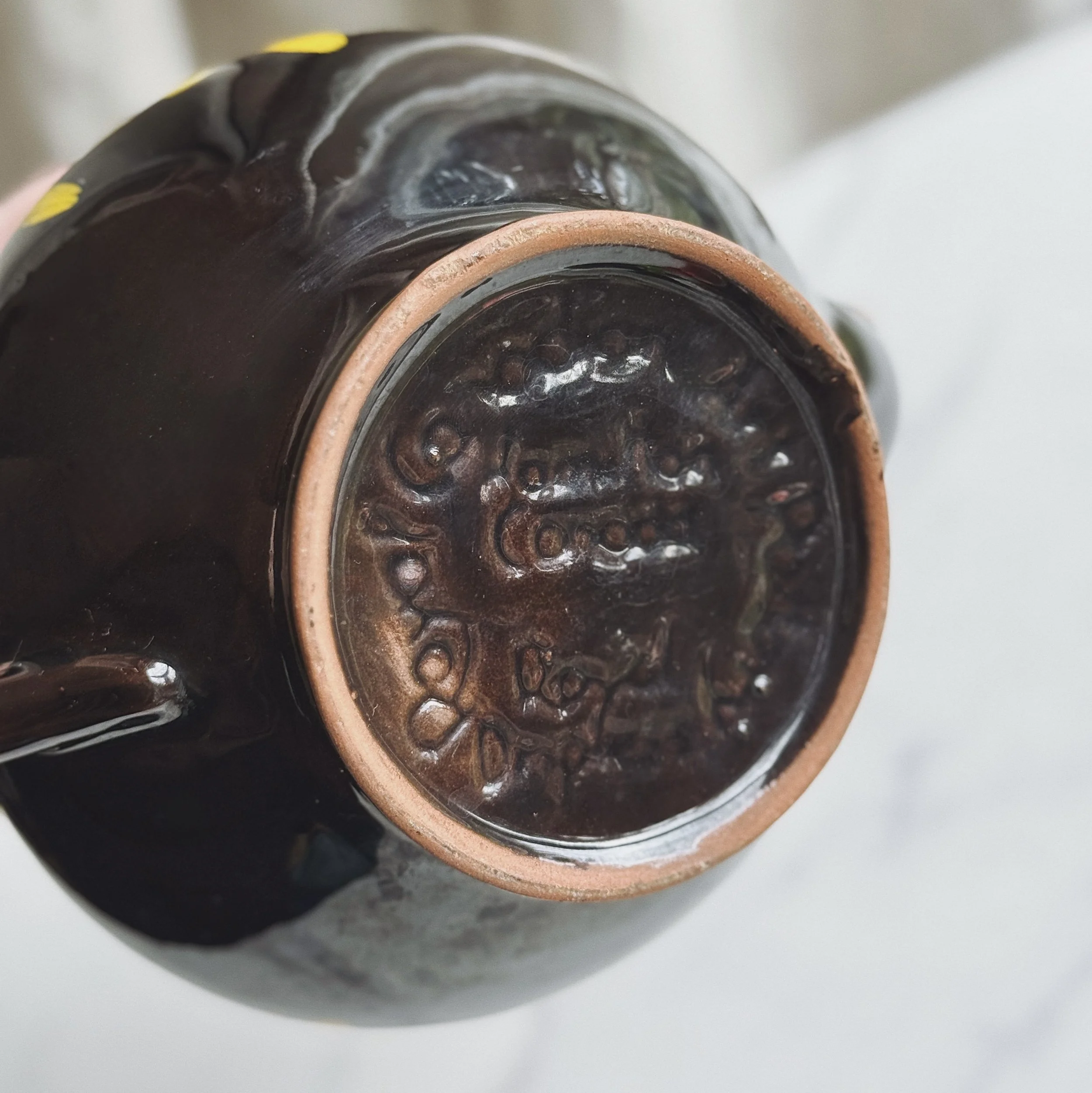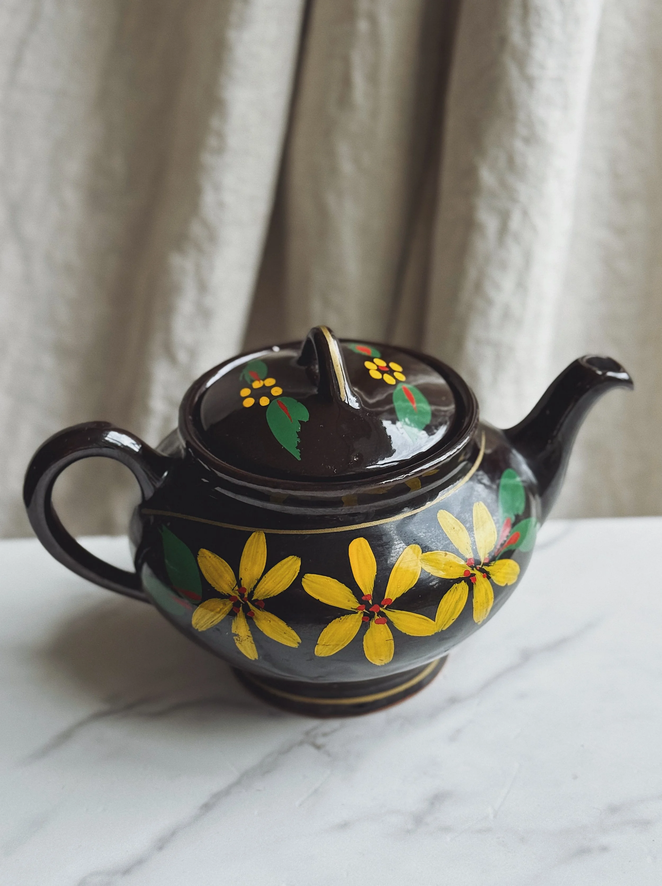 Glossy black midcentury modern pottery teapot with hand-painted florals.