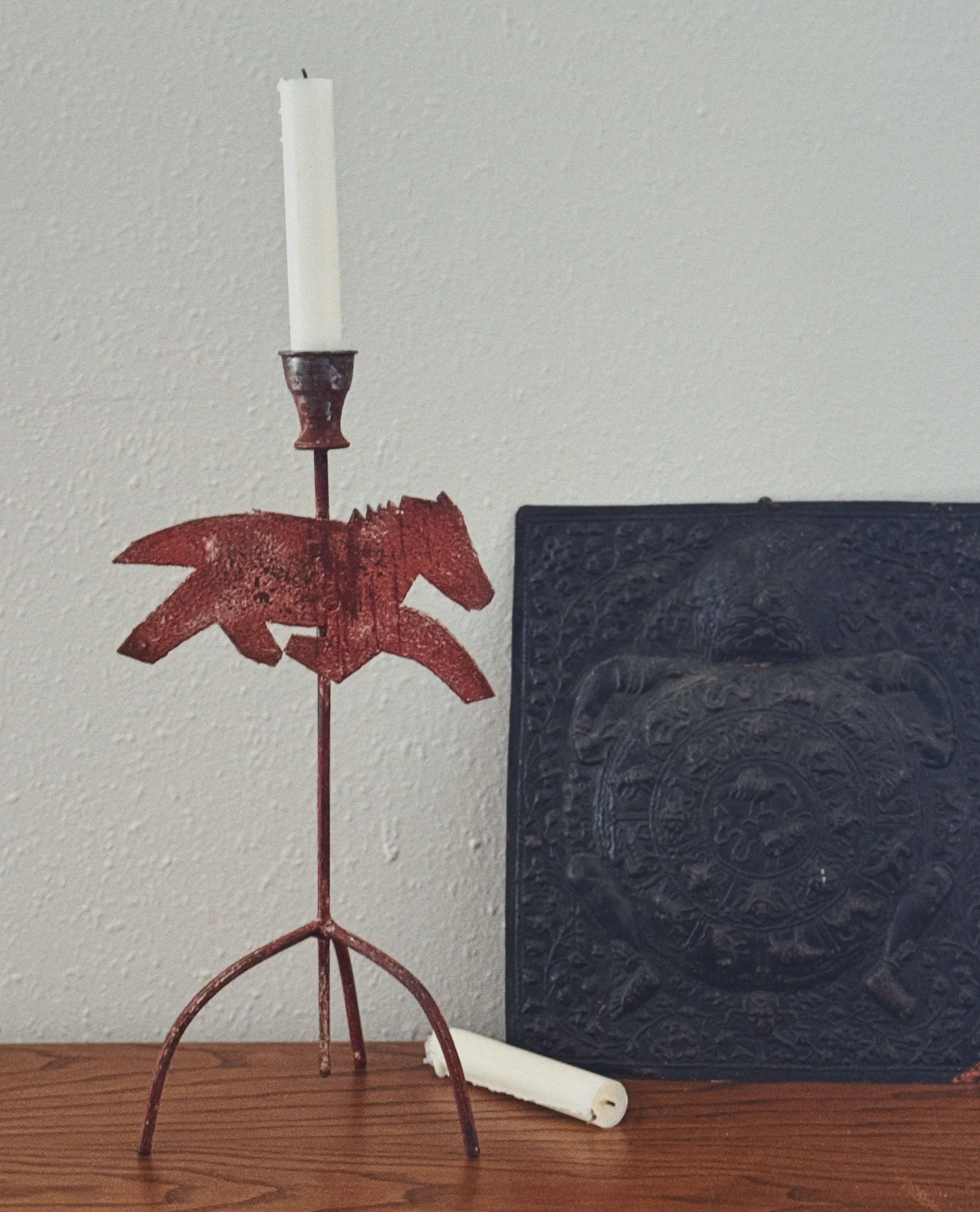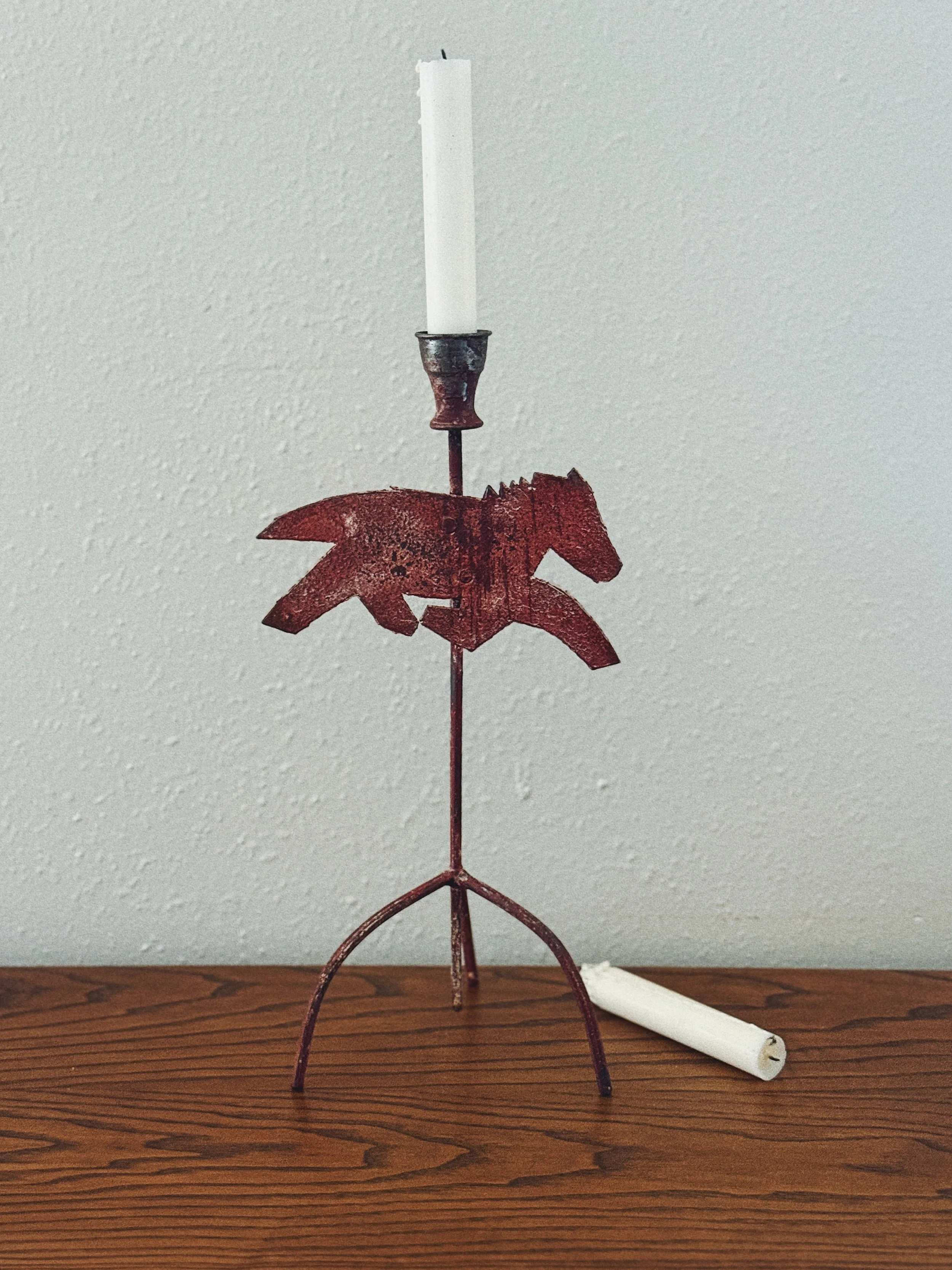 A sculptural iron candle holder featuring a primitive running horse silhouette in a rich, weathered red finish. The tripod base gives it height and presence, while the horse form adds movement and charm.