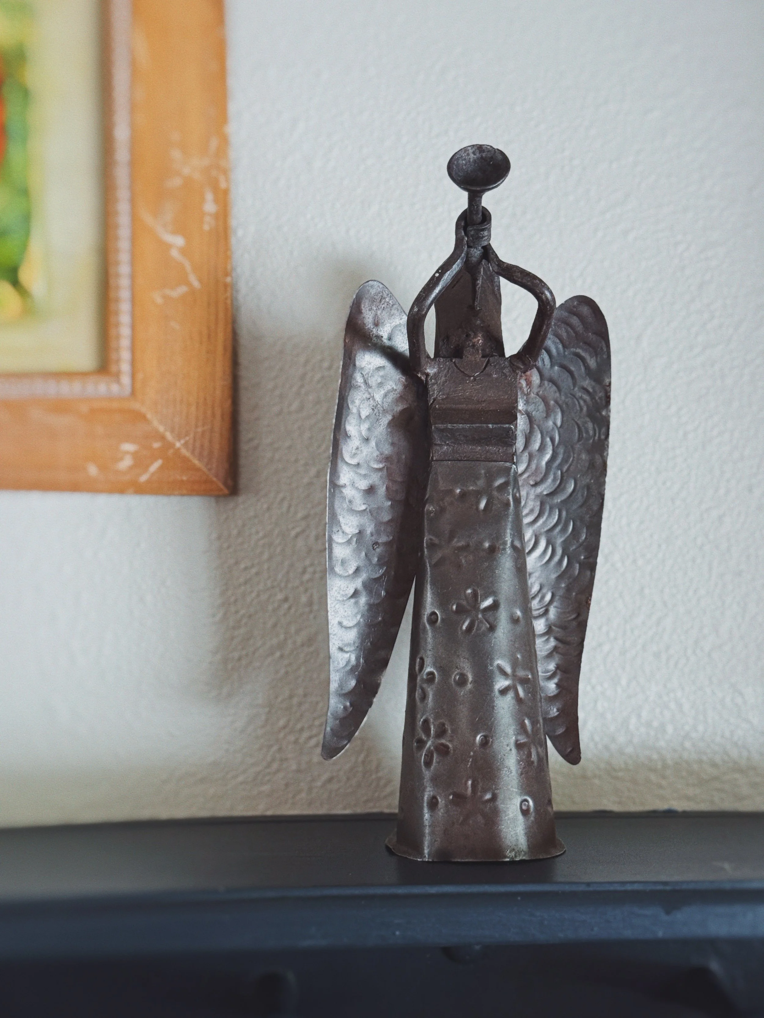A hand-formed metal angel with softly scalloped wings and punched floral detailing. The silhouette is simple and sculptural, with a warm, aged finish that gives it quiet character.