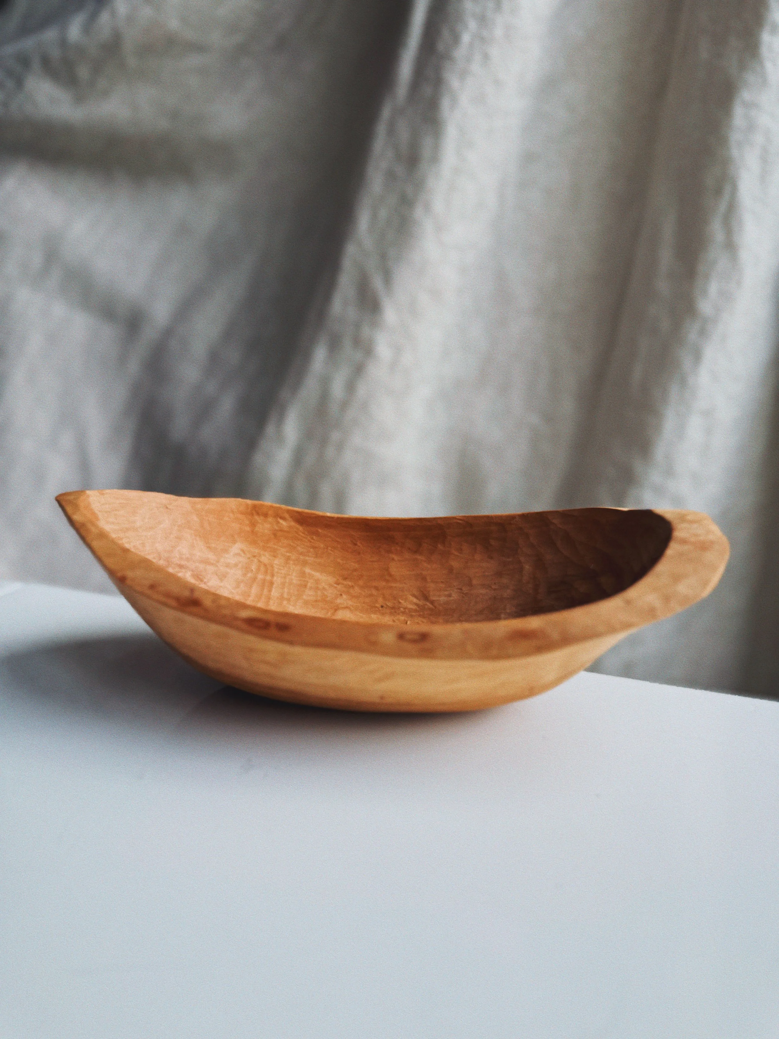 A beautifully hand-carved wooden bowl with a modernist, asymmetric oval silhouette - perfect as a fruit bowl, centerpiece, or everyday catchall.