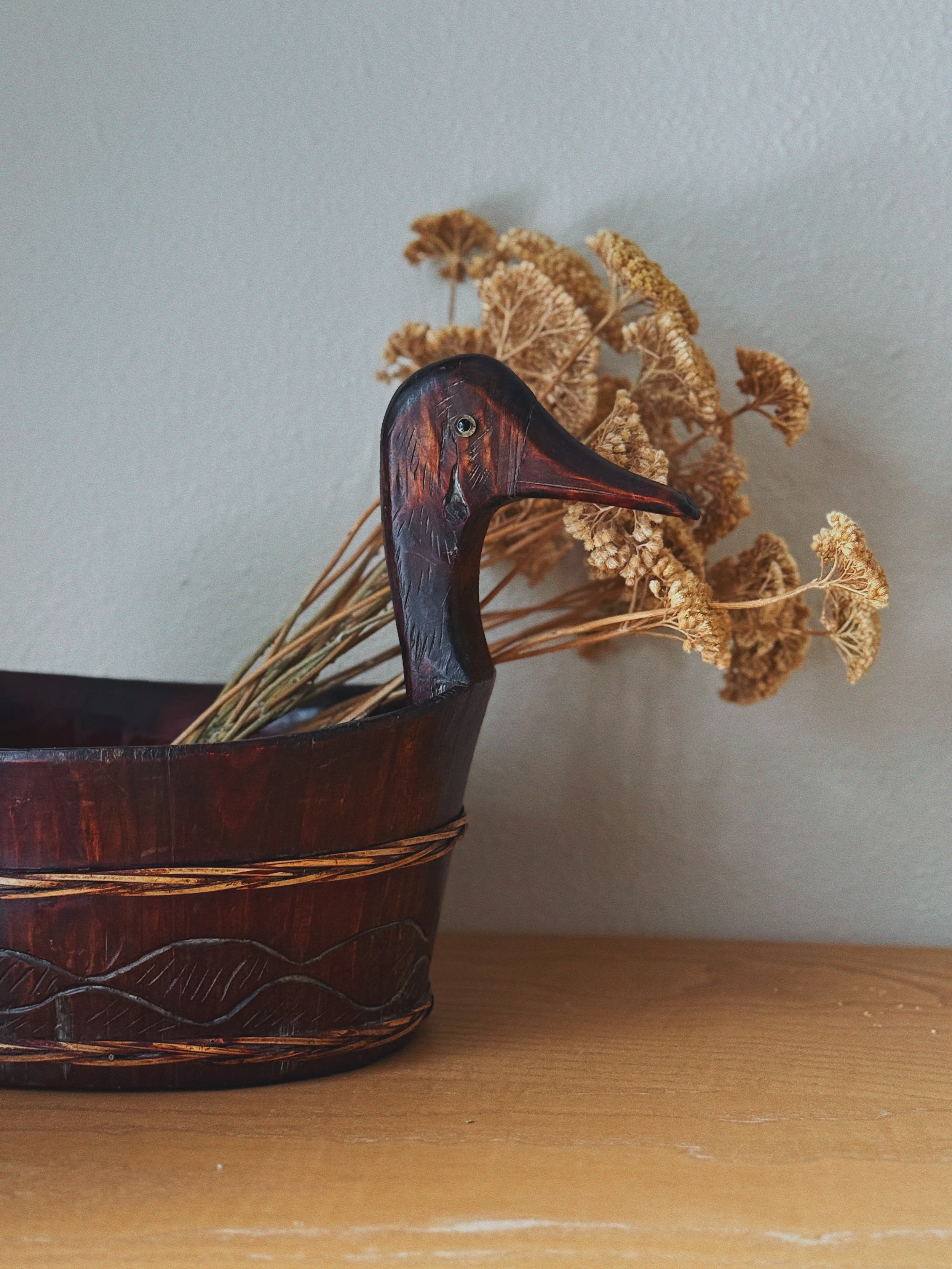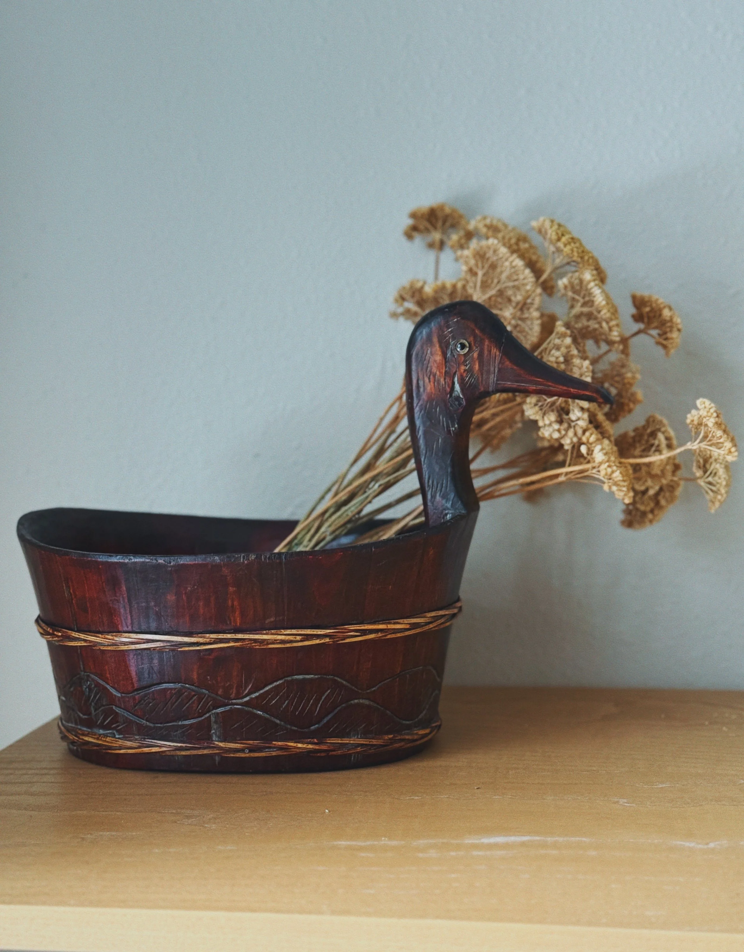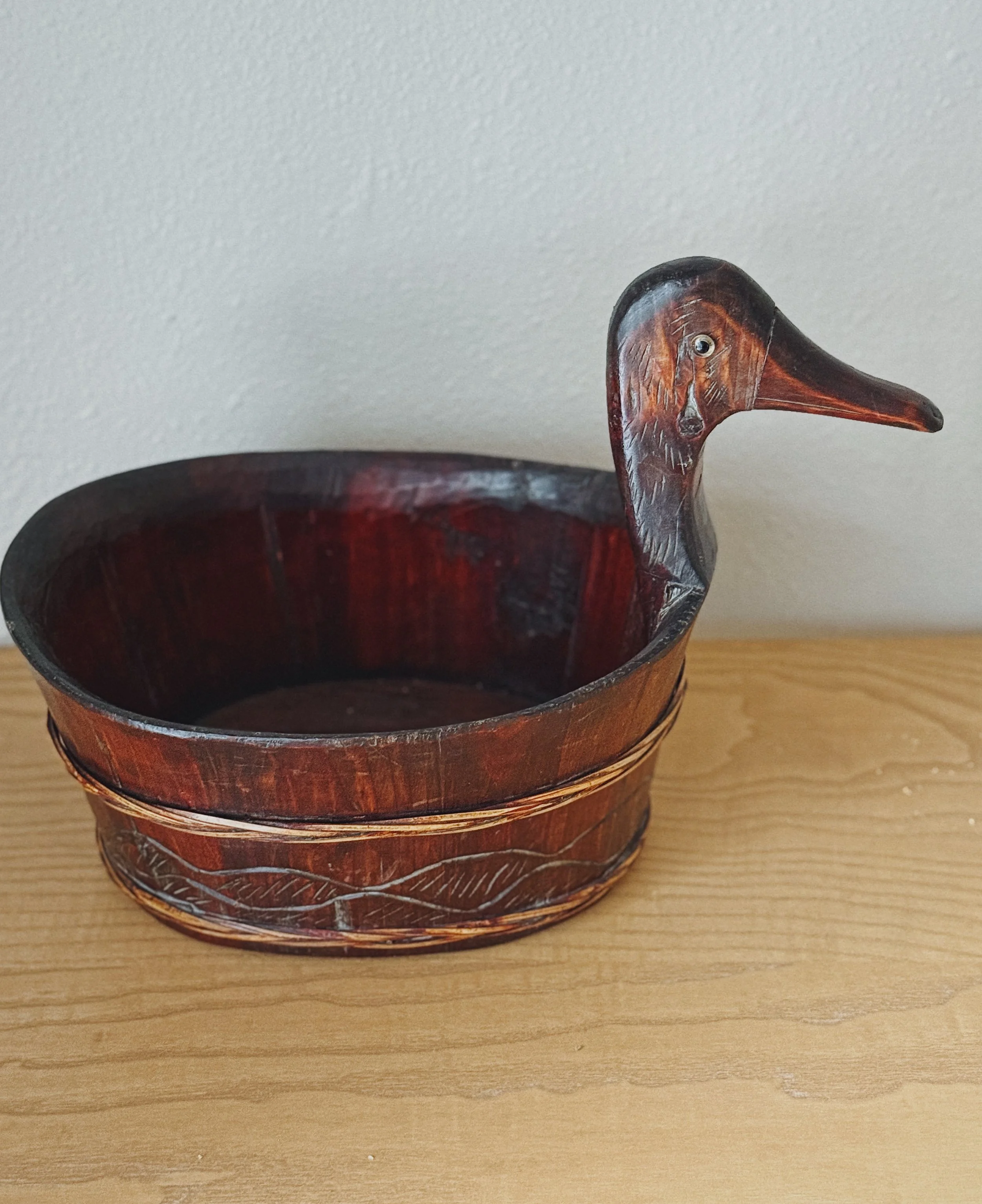 A richly stained large carved wooden vessel with a sculpted duck head handle and incised detailing along the base.