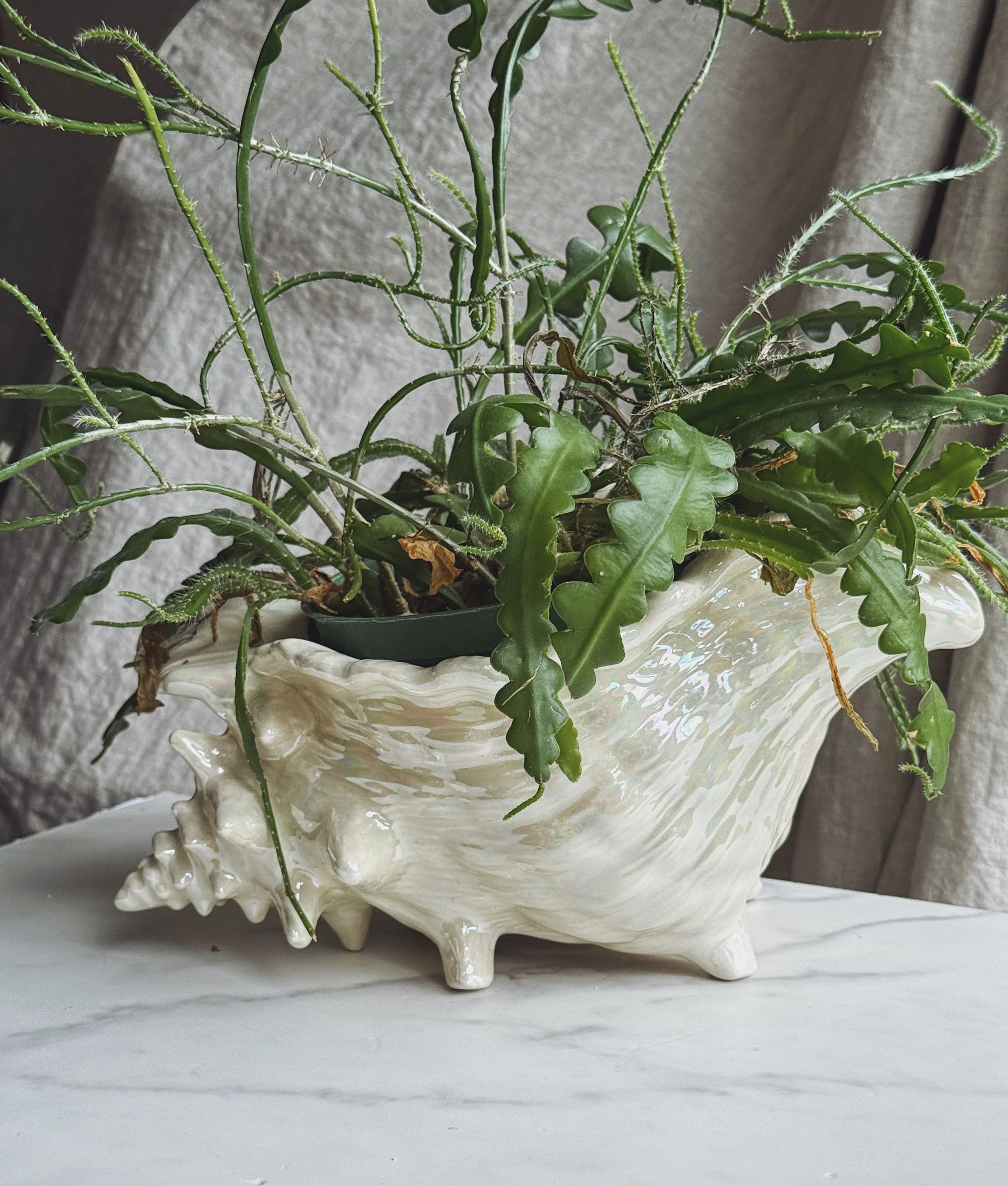 A vintage statement glazed shell planter with a luminous iridescent pink interior.