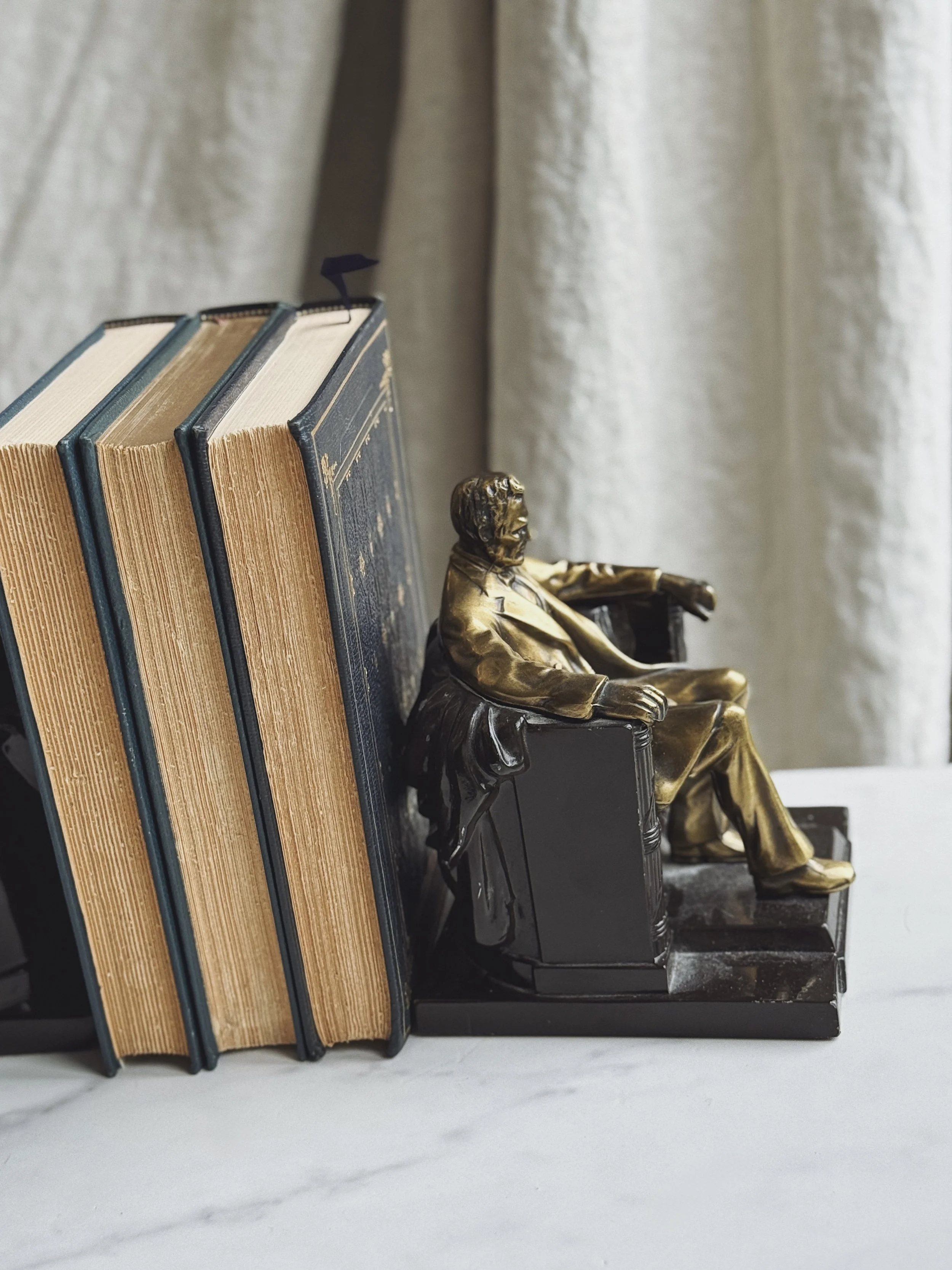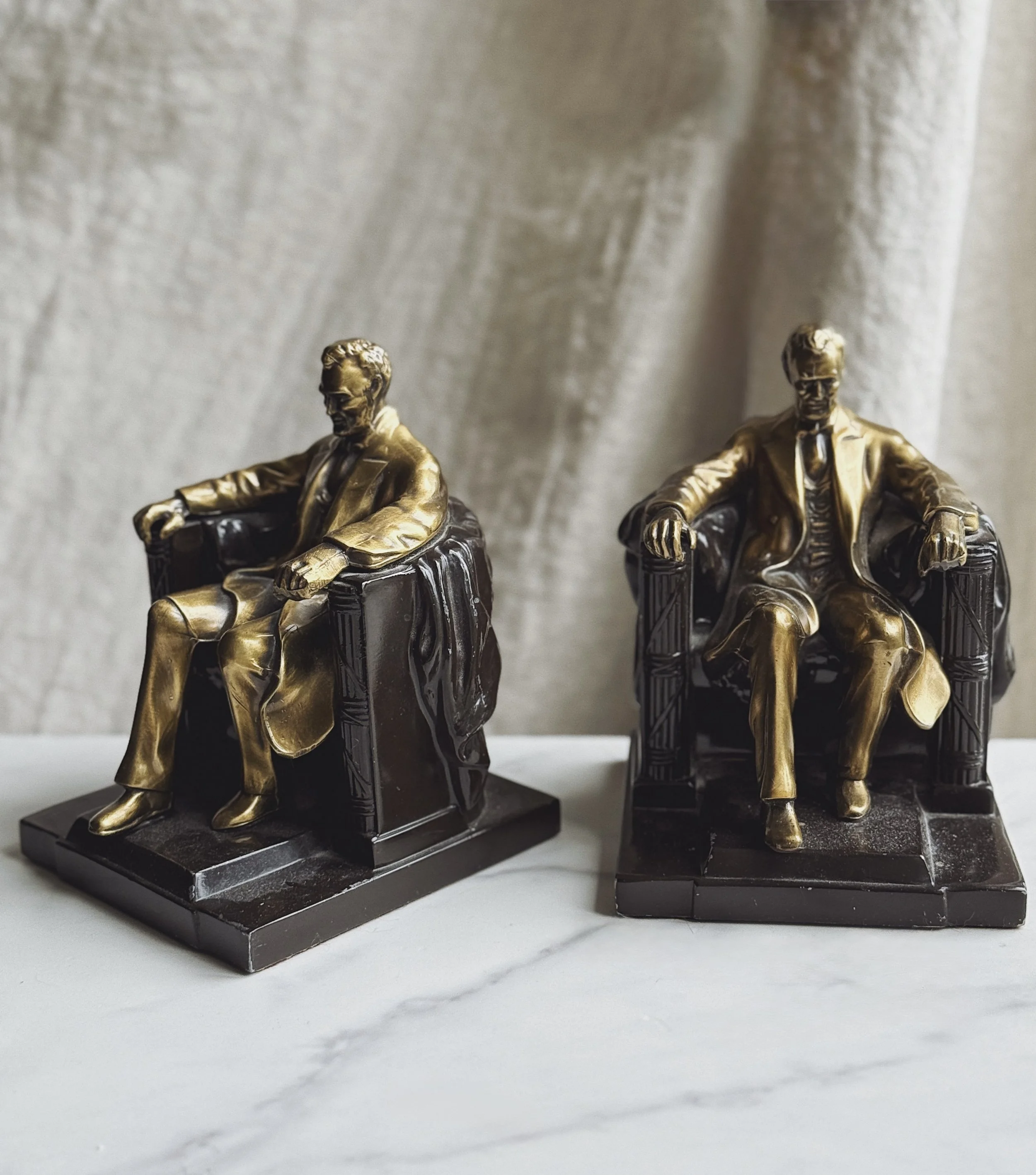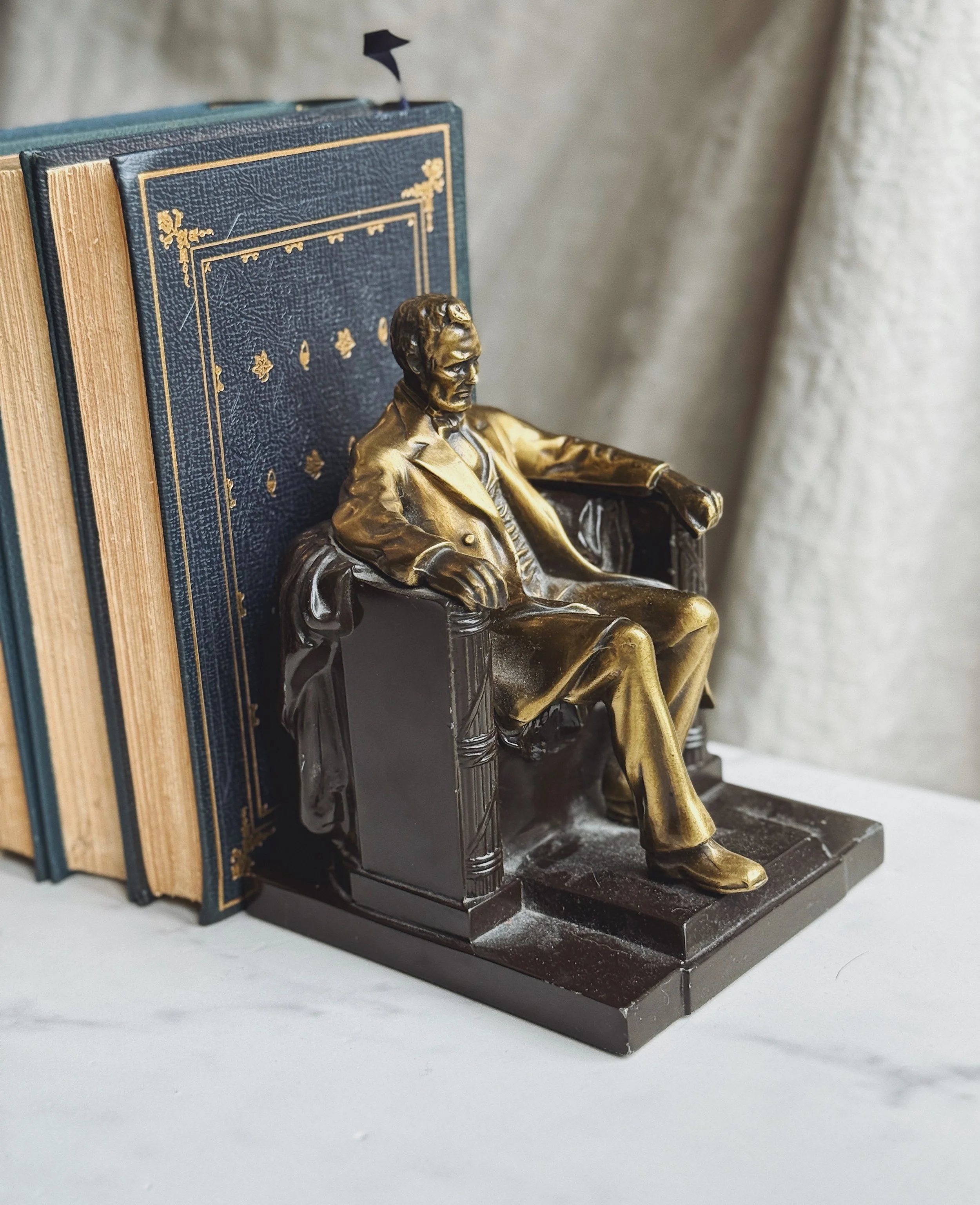 Vintage cast brass and metal MCM bookends depicting Abraham Lincoln. Solid metal, heavy. Size: