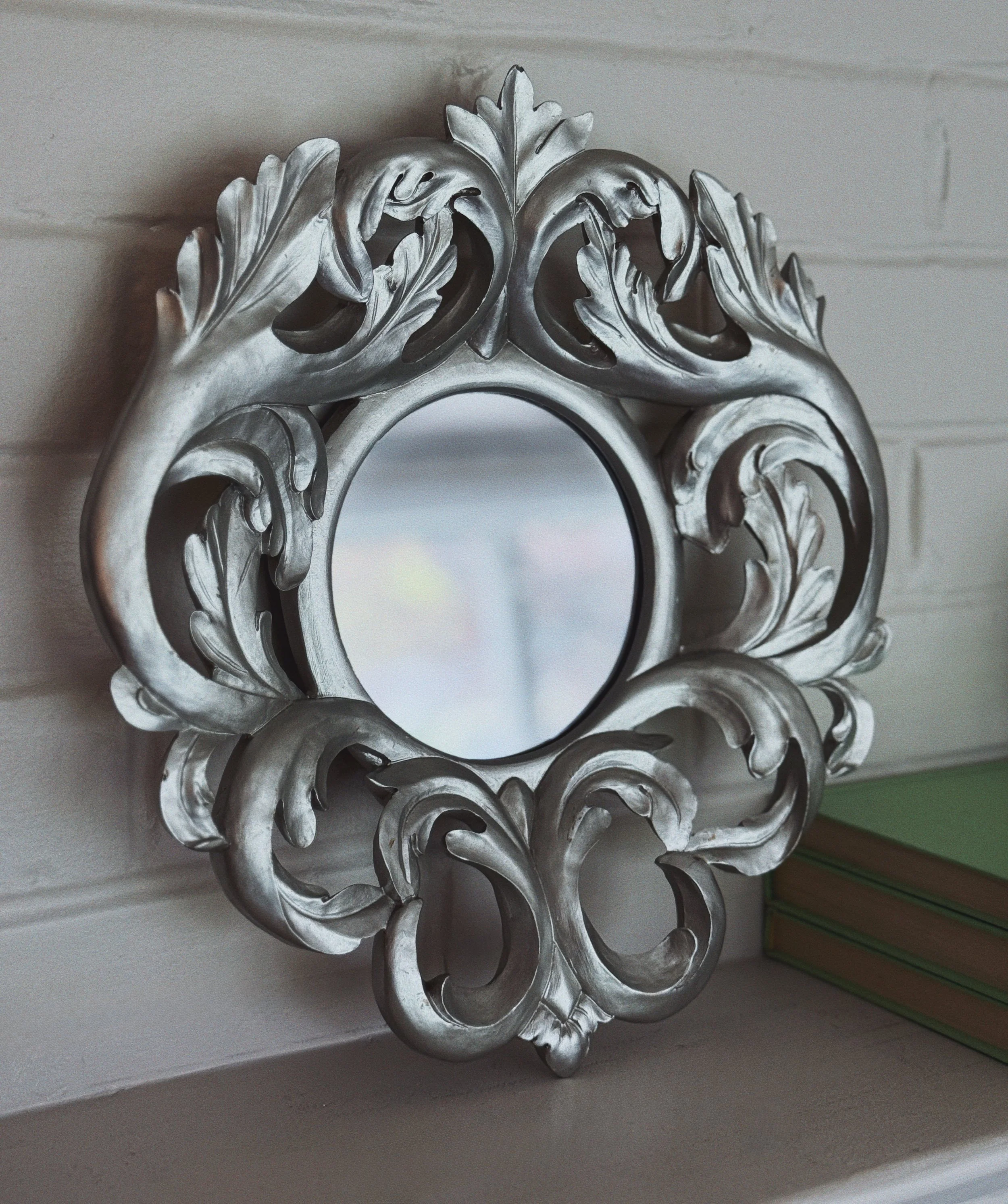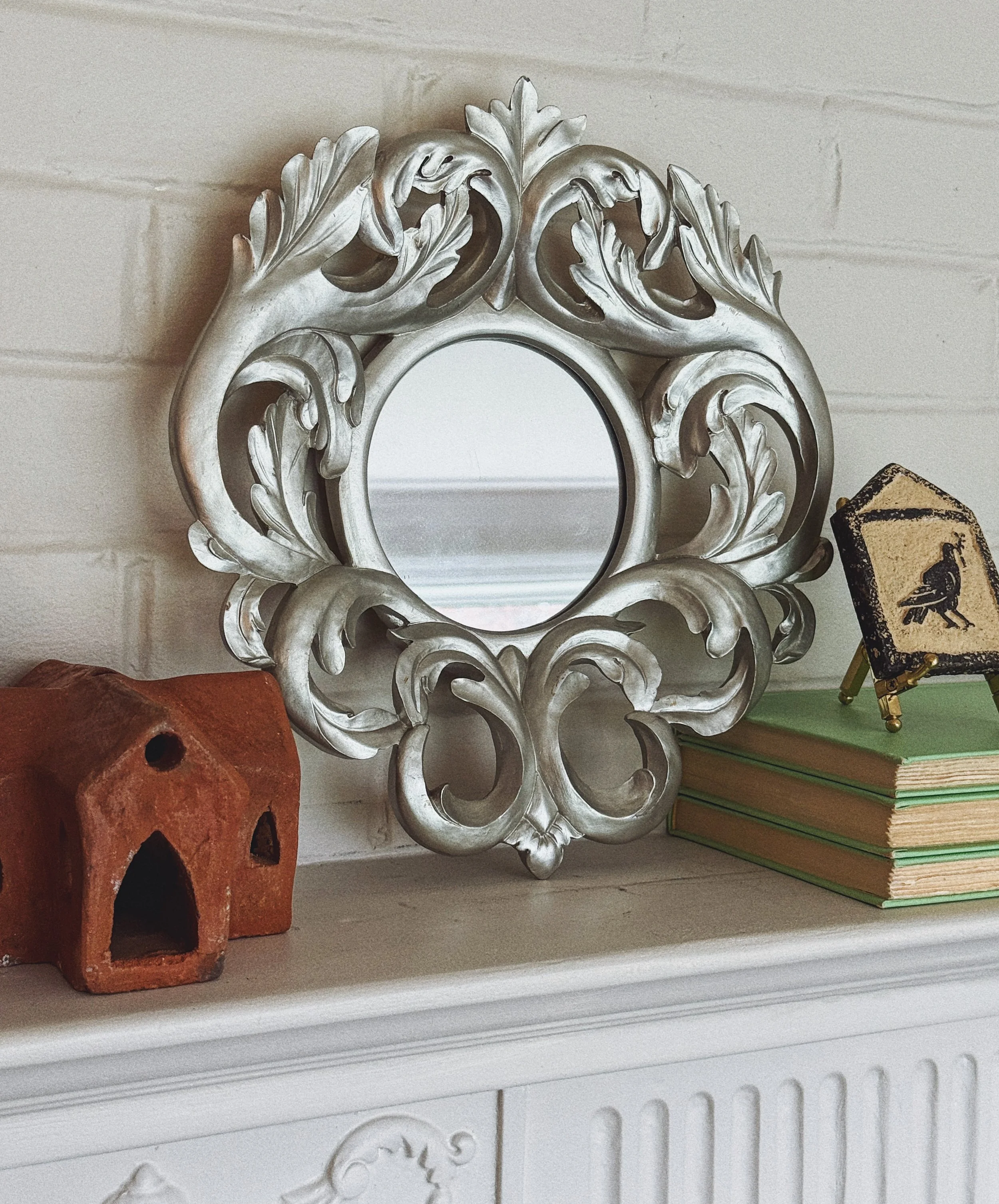 Ornate midcentury modern wall mirror with scrolling detail, silver-painted wood.