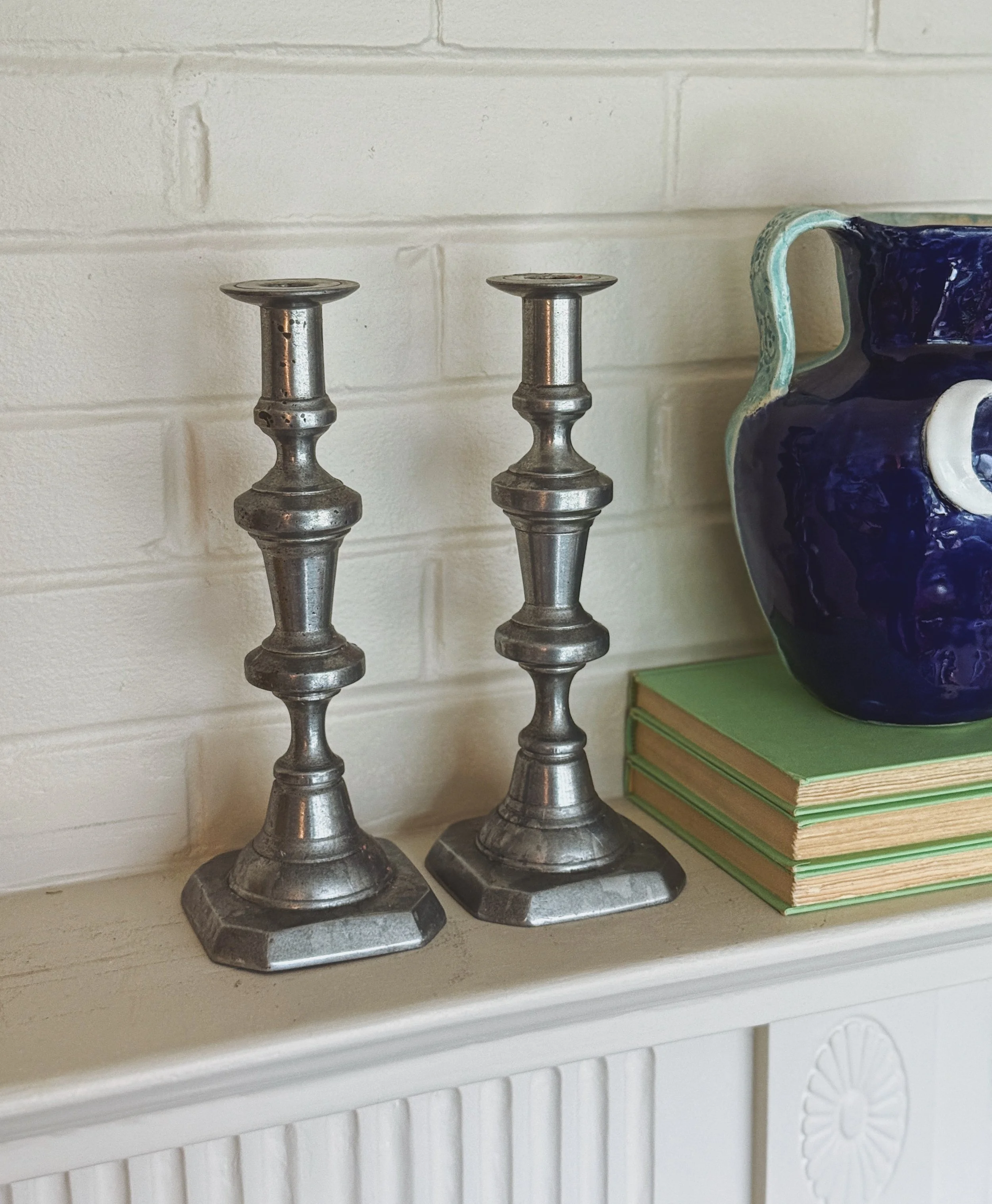 Pair of pewter candlesticks. Size: Approx. 8.5"� H. Note: Please carefully inspect all photos before purchasing. Vintage items are sold as-is and may show signs of age or wear. All sales are final.