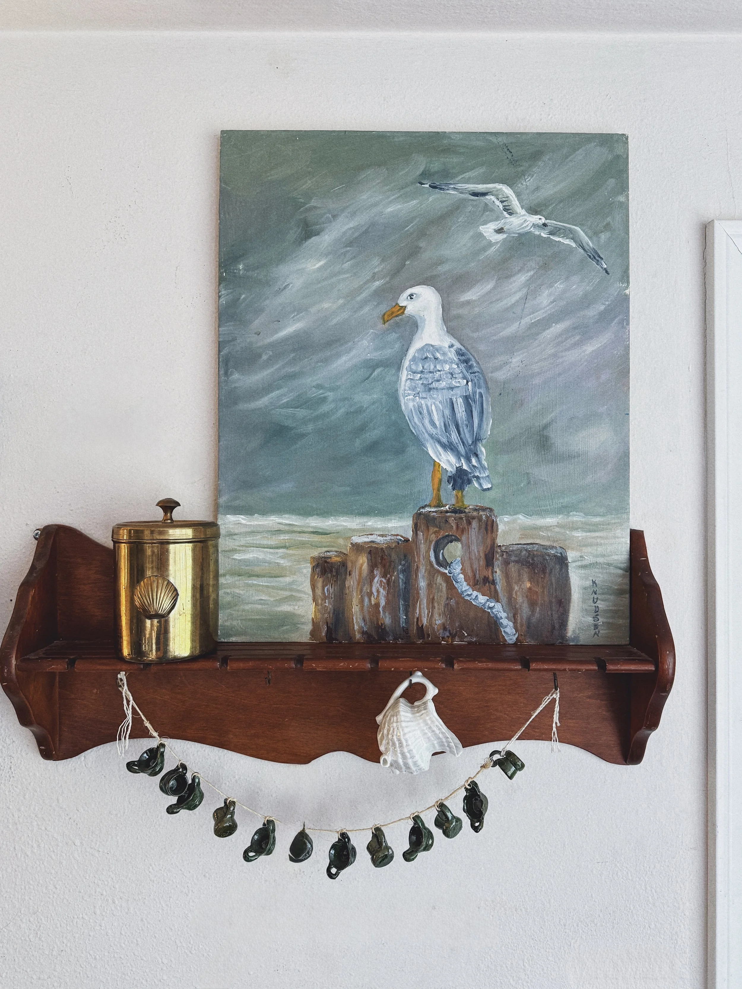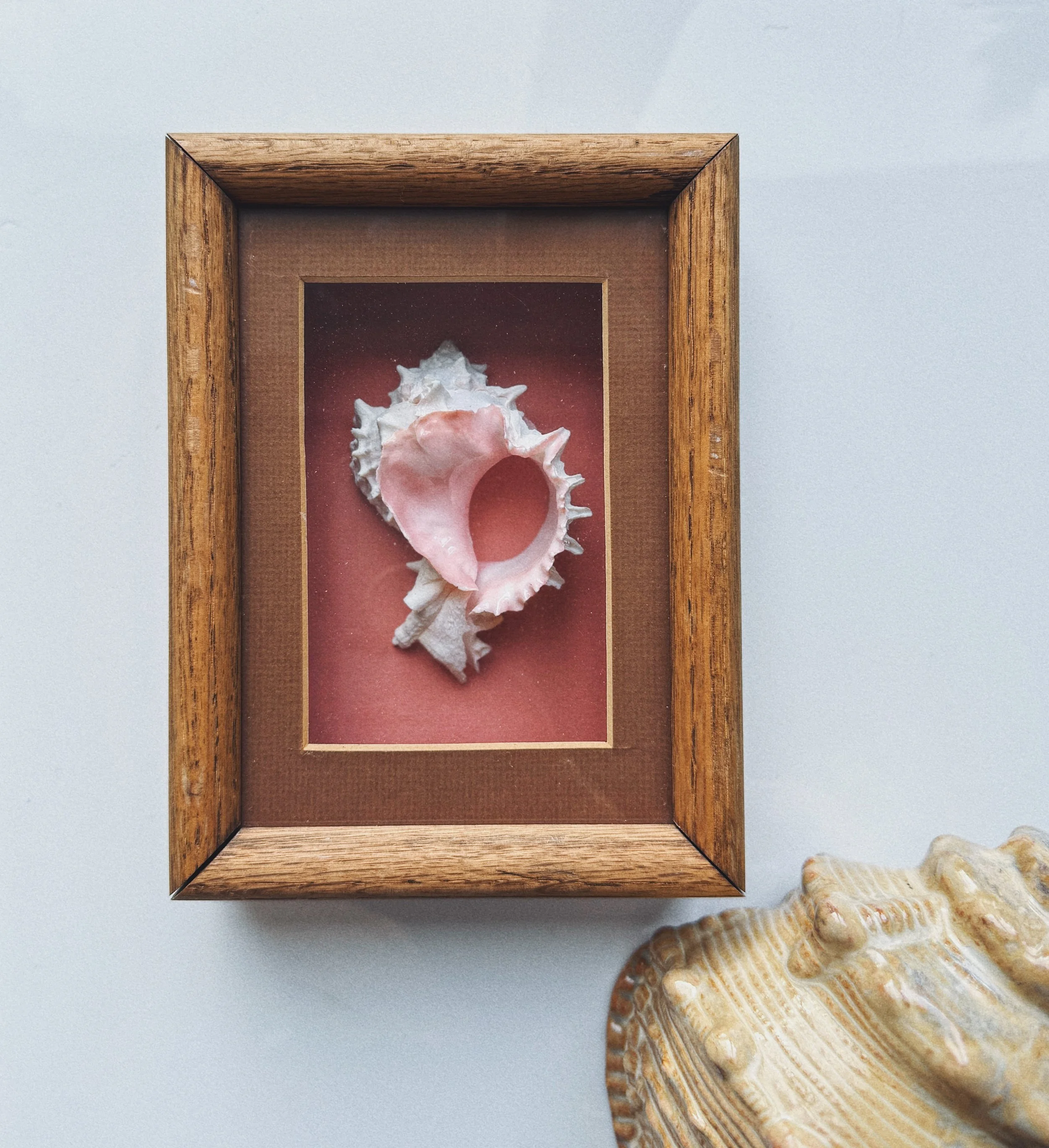 A romantic coastal shell study featuring a blush pink murex set against a deep coral ground and finished with a warm wood frame and linen mat. Softly nostalgic and beach-house ready - lovely layered into a gallery wall or styled on a bookshelf.