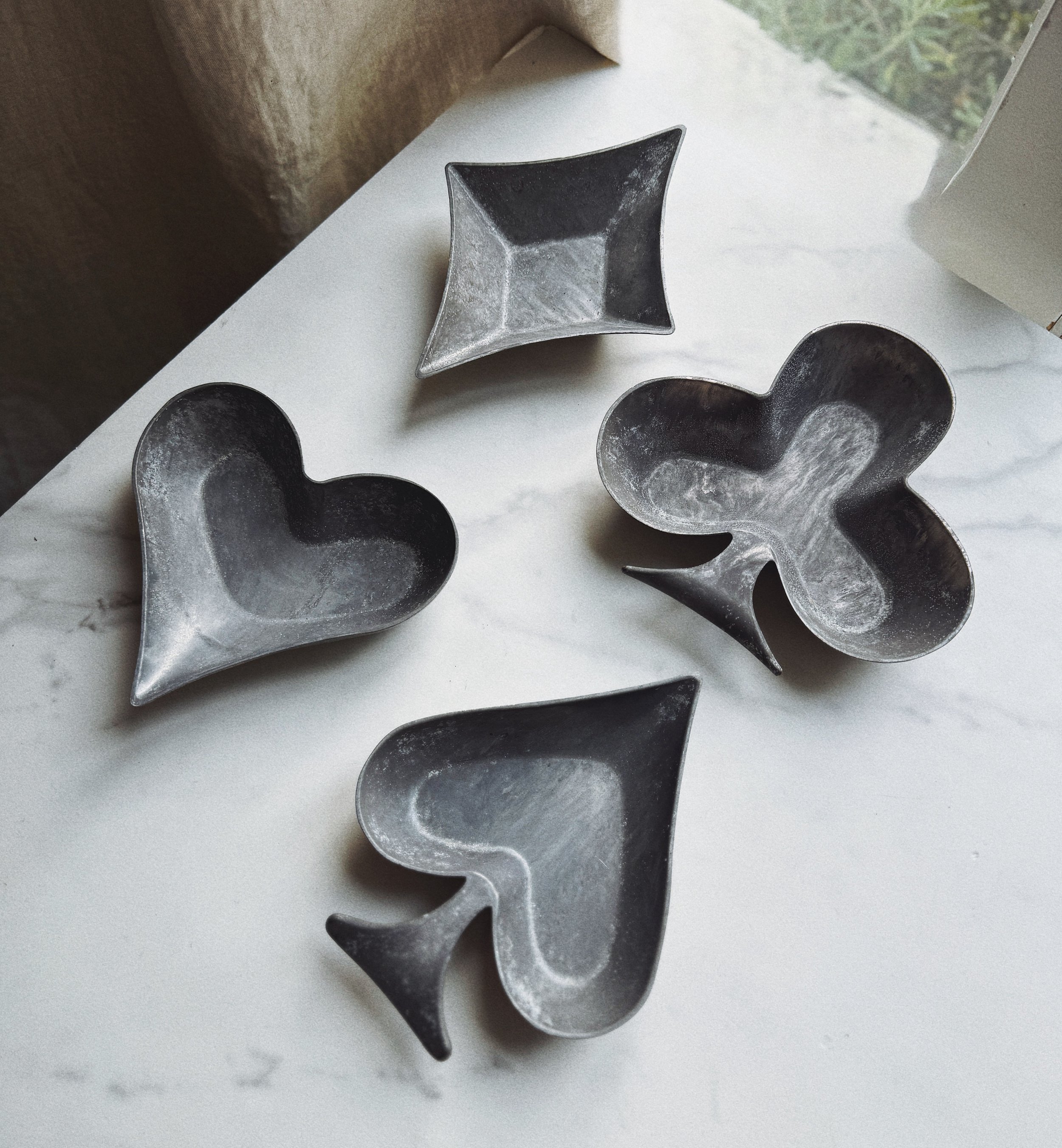 Vintage set of four sculptural pewter dishes in heart, spade, club, and diamond forms. Danish modern style.