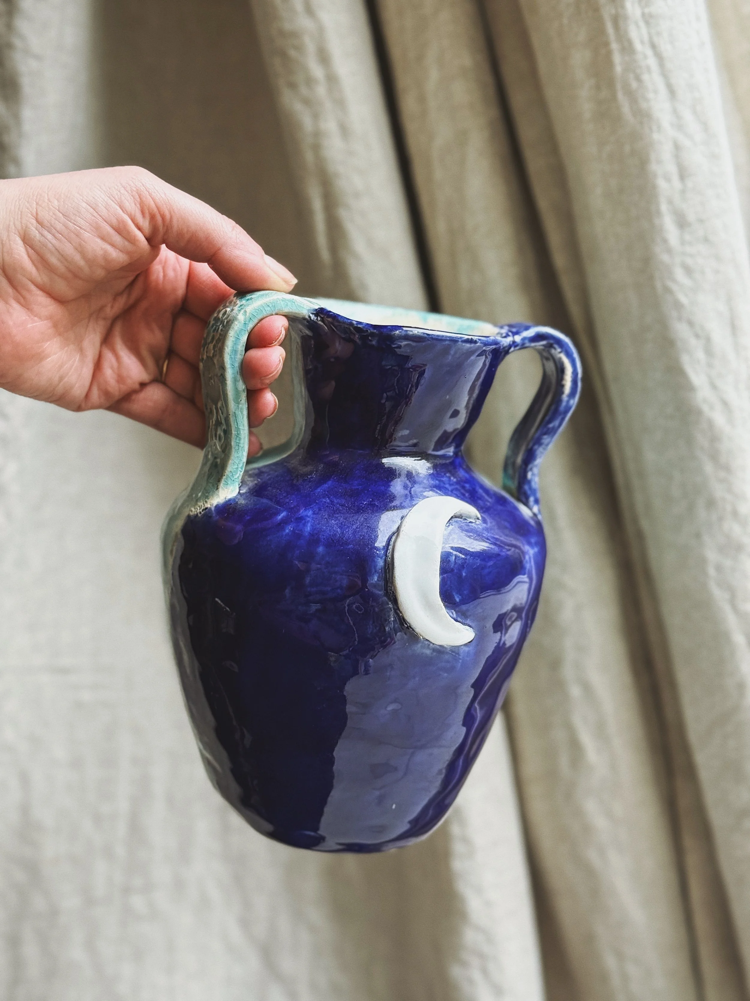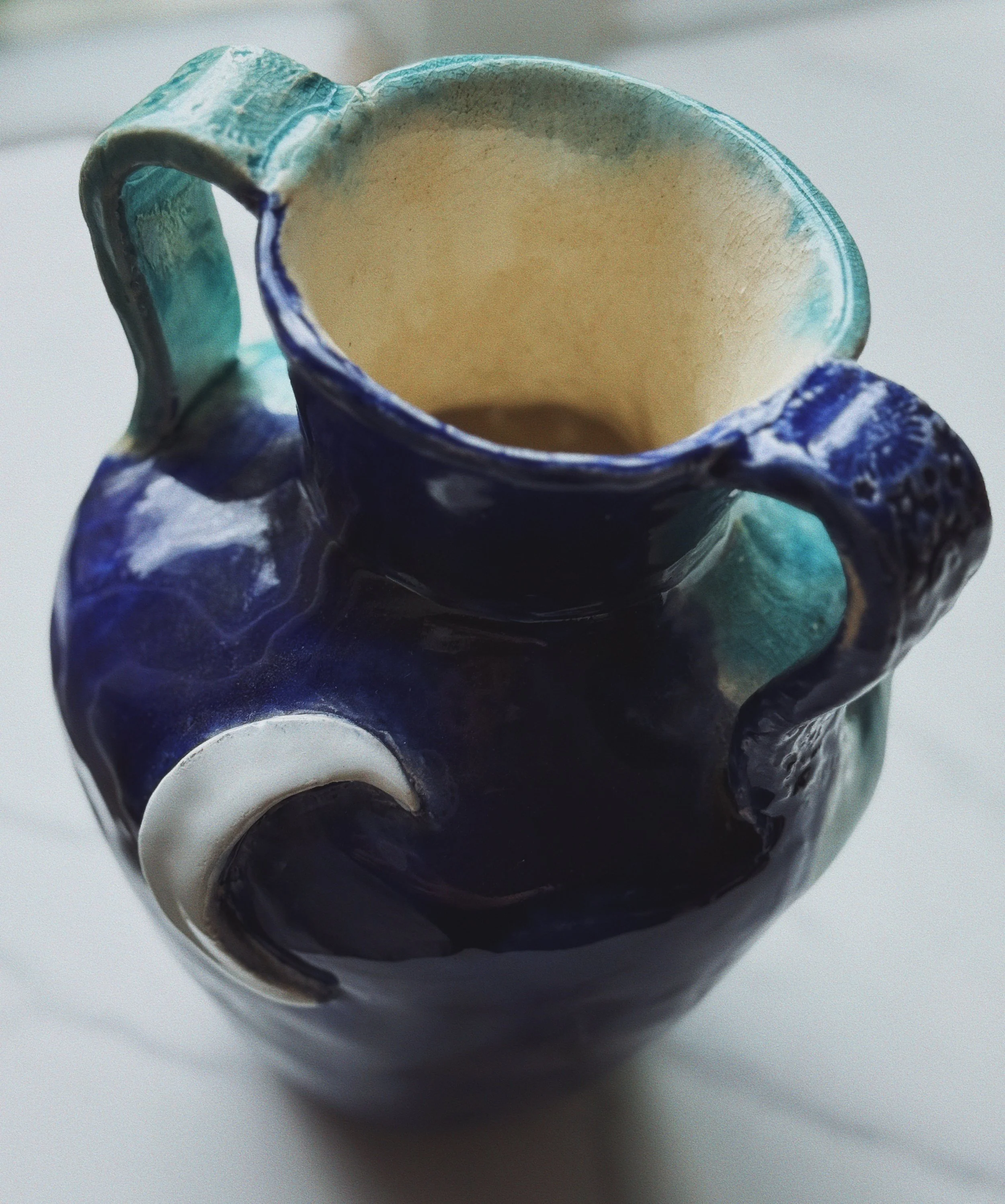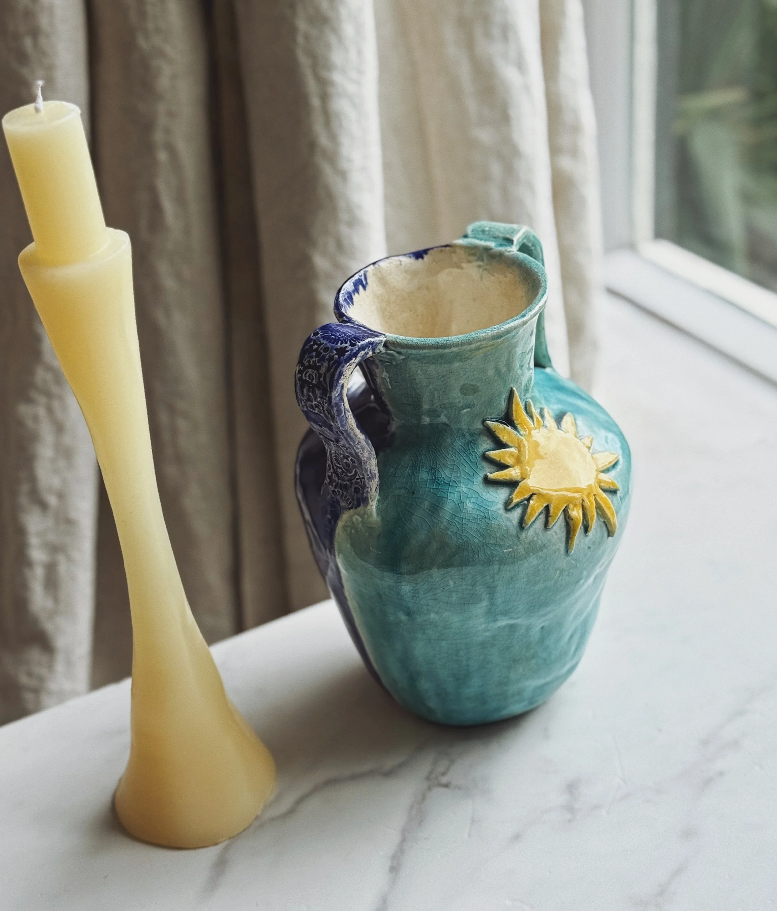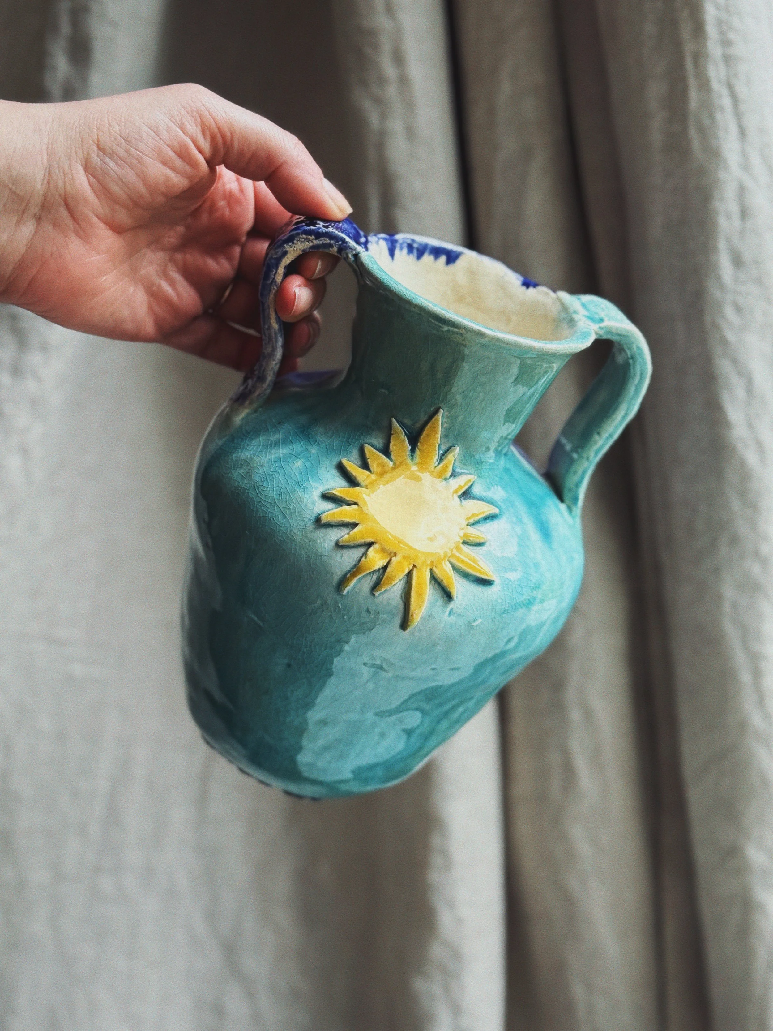 Ceramic pitcher with sun and moon motif and split blue glaze.